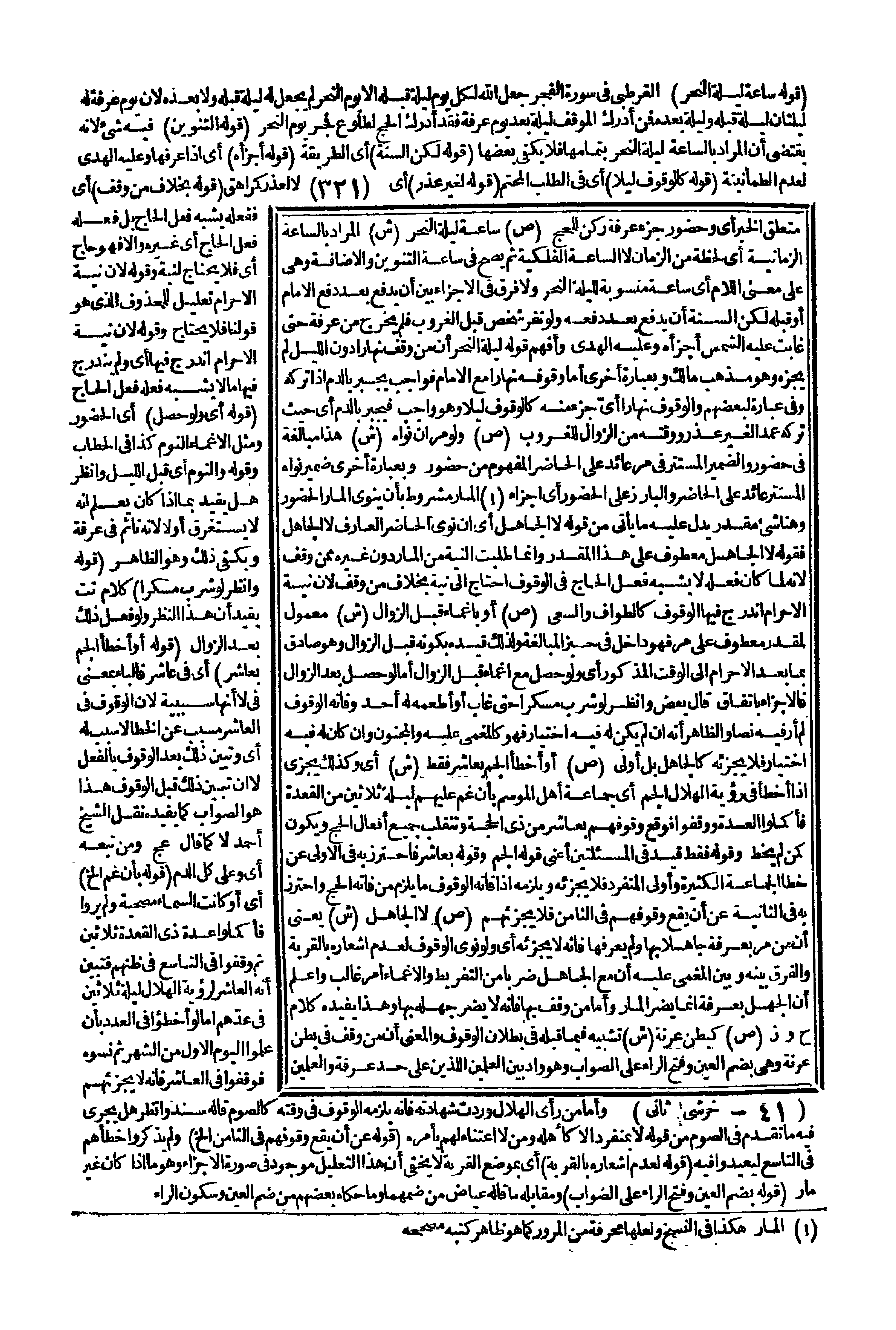 (ص) سَاعَةَ لَيْلَةِ النَّحْرِ (ش) الْمُرَادُ بِالسَّاعَةِ الزَّمَانِيَّةُ أَيْ: لَحْظَةٌ مِنْ الزَّمَانِ لَا السَّاعَةُ الْفَلَكِيَّةُ، ثُمَّ يَصِحُّ فِي سَاعَةٍ التَّنْوِينُ وَالْإِضَافَةُ وَهِيَ عَلَى مَعْنَى اللَّامِ أَيْ: سَاعَةٌ مَنْسُوبَةٌ لِلَيْلَةِ النَّحْرِ، وَلَا فَرْقَ فِي الْإِجْزَاءِ بَيْنَ أَنْ يَدْفَعَ بَعْدَ دَفْعِ الْإِمَامِ، أَوْ قَبْلَهُ لَكِنَّ السُّنَّةَ أَنْ يَدْفَعَ بَعْدَ دَفْعِهِ، وَلَوْ نَفَرَ شَخْصٌ قَبْلَ الْغُرُوبِ فَلَمْ يَخْرُجْ مِنْ عَرَفَةَ حَتَّى غَابَتْ عَلَيْهِ الشَّمْسُ أَجْزَأَهُ وَعَلَيْهِ الْهَدْيُ، وَأَفْهَمَ قَوْلُهُ لَيْلَةَ النَّحْرِ أَنَّ مَنْ وَقَفَ نَهَارًا دُونَ اللَّيْلِ لَمْ يُجْزِهِ وَهُوَ مَذْهَبُ مَالِكٍ، وَبِعِبَارَةٍ أُخْرَى، أَمَّا وُقُوفُهُ نَهَارًا مَعَ الْإِمَامِ فَوَاجِبٌ، يُجْبَرُ بِالدَّمِ إذَا تَرَكَهُ وَفِي عِبَارَةٍ لِبَعْضِهِمْ: وَالْوُقُوفُ نَهَارًا أَيَّ جُزْءٍ مِنْهُ كَالْوُقُوفِ لَيْلًا، وَهُوَ وَاجِبٌ فَيُجْبَرُ بِالدَّمِ أَيْ: حَيْثُ تَرَكَهُ عَمْدًا لِغَيْرِ عُذْرٍ وَوَقْتُهُ مِنْ الزَّوَالِ لِلْغُرُوبِ (ص) ، وَلَوْ مَرَّ أَنْ نَوَاهُ (ش) هَذَا مُبَالَغَةٌ فِي حُضُورُ وَالضَّمِيرُ الْمُسْتَتِرُ فِي مَرَّ عَائِدٌ عَلَى الْحَاضِرِ الْمَفْهُومِ مِنْ حُضُورٍ، وَبِعِبَارَةٍ أُخْرَى ضَمِيرُ نَوَاهُ الْمُسْتَتِرُ عَائِدٌ عَلَى الْحَاضِرِ، وَالْبَارِزُ عَلَى الْحُضُورِ أَيْ: إجْزَاءُ الْمَارِّ مَشْرُوطٌ بِأَنْ يَنْوِيَ الْمَارُّ الْحُضُورَ وَهُنَا شَيْءٌ مُقَدَّرٌ يَدُلُّ عَلَيْهِ مَا يَأْتِي مِنْ قَوْلِهِ: لَا الْجَاهِلُ أَيْ: إنْ نَوَى الْحَاضِرُ الْعَارِفُ لَا الْجَاهِلُ فَقَوْلُهُ: " لَا الْجَاهِلُ: مَعْطُوفٌ عَلَى هَذَا الْمُقَدَّرِ، وَإِنَّمَا طُلِبَتْ النِّيَّةُ مِنْ الْمَارِّ دُونَ غَيْرِهِ مِمَّنْ وَقَفَ؛ لِأَنَّهُ لَمَّا كَانَ فِعْلُهُ لَا يُشْبِهُ فِعْلَ الْحَاجِّ فِي الْوُقُوفِ احْتَاجَ إلَى نِيَّةٍ بِخِلَافِ مَنْ وَقَفَ؛ لِأَنَّ نِيَّةَ الْإِحْرَامِ انْدَرَجَ فِيهَا الْوُقُوفُ كَالطَّوَافِ وَالسَّعْيِ.