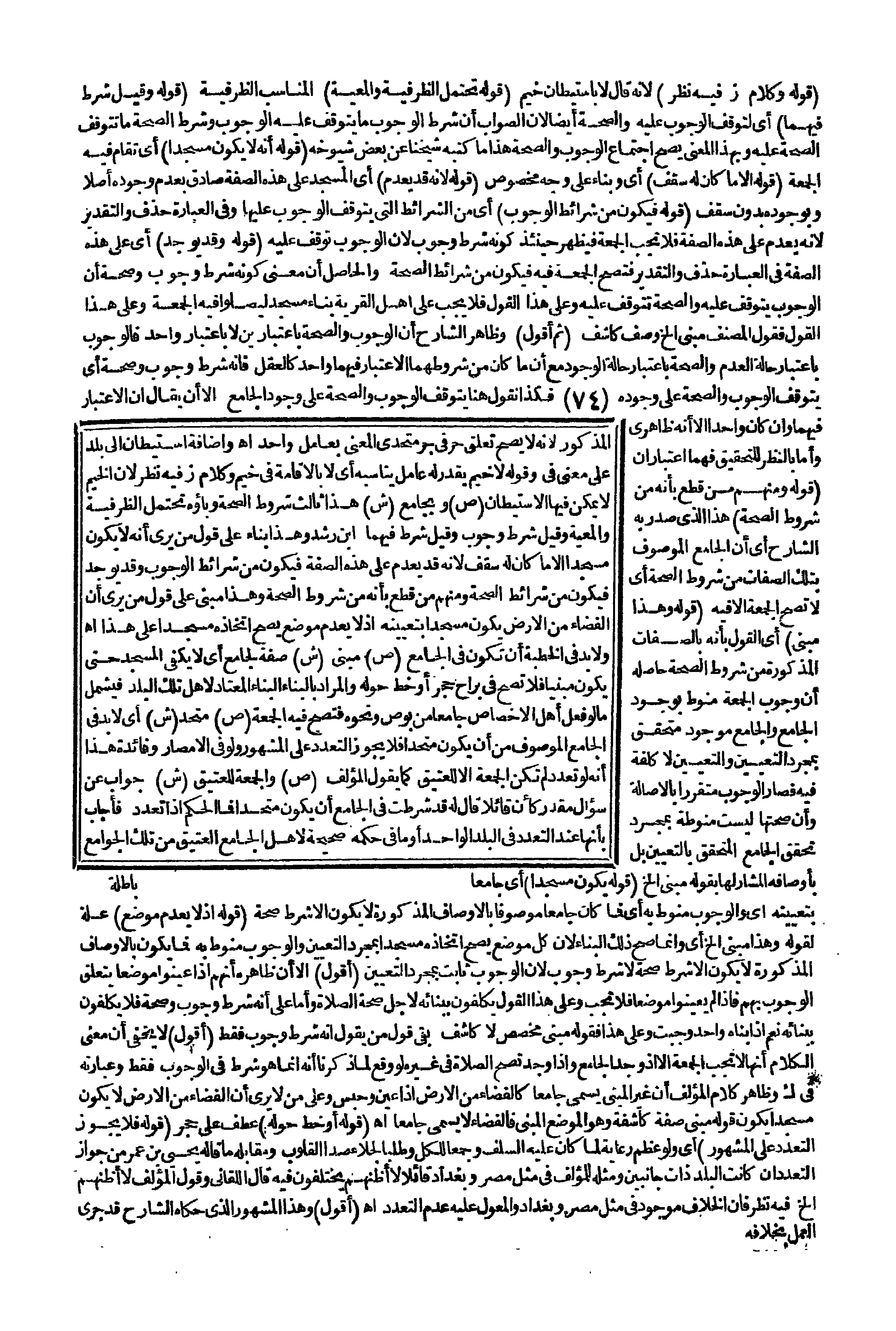 (قَوْلُهُ: تَحْتَمِلُ الظَّرْفِيَّةَ وَالْمَعِيَّةَ) الْمُنَاسِبُ: الظَّرْفِيَّةَ (قَوْلُهُ: وَقِيلَ شَرْطٌ فِيهِمَا) أَيْ لِتَوَقُّفِ الْوُجُوبِ عَلَيْهِ وَالصِّحَّةِ أَيْضًا؛ لِأَنَّ الصَّوَابَ أَنَّ شَرْطَ الْوُجُوبِ مَا يَتَوَقَّفُ عَلَيْهِ الْوُجُوبُ وَشَرْطَ الصِّحَّةِ مَا تَتَوَقَّفُ الصِّحَّةُ عَلَيْهِ وَبِهَذَا الْمَعْنَى يَصِحُّ اجْتِمَاعُ الْوُجُوبُ وَالصِّحَّةُ هَذَا مَا كَتَبَهُ شَيْخُنَا عَنْ بَعْضِ شُيُوخِهِ (قَوْلُهُ إنَّهُ لَا يَكُونُ مَسْجِدًا) أَيْ تُقَامُ فِيهِ الْجُمُعَةُ (قَوْلُهُ إلَّا مَا كَانَ لَهُ سَقْفٌ) أَيْ وَبِنَاءٌ عَلَى وَجْهٍ مَخْصُوصٍ (قَوْلُهُ: لِأَنَّهُ قَدْ يُعْدَمُ) أَيْ الْمَسْجِدُ عَلَى هَذِهِ الصِّفَةِ صَادِقٌ بِعَدَمِ وُجُودِهِ أَصْلًا وَبِوُجُودِهِ بِدُونِ سَقْفٍ (قَوْلُهُ: فَيَكُونُ مِنْ شَرَائِطِ الْوُجُوبِ) أَيْ مِنْ الشَّرَائِطِ الَّتِي يَتَوَقَّفُ الْوُجُوبُ عَلَيْهَا وَفِي الْعِبَارَةِ حَذْفٌ وَالتَّقْدِيرُ؛ لِأَنَّهُ يُعْدَمُ عَلَى هَذِهِ الصِّفَةِ فَلَا تَجِبُ الْجُمُعَةُ فَيَظْهَرُ حِينَئِذٍ كَوْنُهُ شَرْطَ وُجُوبٍ؛ لِأَنَّ الْوُجُوبَ تَوَقَّفَ عَلَيْهِ (قَوْلُهُ: وَقَدْ يُوجَدُ) أَيْ عَلَى هَذِهِ الصِّفَةِ فِي الْعِبَارَةِ حَذْفٌ وَالتَّقْدِيرُ فَتَصِحُّ الْجُمُعَةُ فِيهِ فَيَكُونُ مِنْ شَرَائِطِ الصِّحَّةِ وَالْحَاصِلُ أَنَّ مَعْنَى كَوْنِهِ شَرْطَ وُجُوبٍ وَصِحَّةٍ أَنَّ الْوُجُوبَ يَتَوَقَّفُ عَلَيْهِ وَالصِّحَّةَ تَتَوَقَّفُ عَلَيْهِ وَعَلَى هَذَا الْقَوْلِ فَلَا يَجِبُ عَلَى أَهْلِ الْقَرْيَةِ بِنَاءُ مَسْجِدٍ لِيُصَلُّوا فِيهِ الْجُمُعَةَ وَعَلَى هَذَا الْقَوْلِ فَقَوْلُ الْمُصَنِّفِ مَبْنِيٌّ إلَخْ وَصْفٌ كَاشِفٌ (ثُمَّ أَقُولُ) وَظَاهِرُ الشَّارِحِ أَنَّ الْوُجُوبَ وَالصِّحَّةَ بِاعْتِبَارَيْنِ لَا بِاعْتِبَارٍ وَاحِدٍ، فَالْوُجُوبُ بِاعْتِبَارِ حَالَةِ الْعَدَمِ وَالصِّحَّةُ بِاعْتِبَارِ حَالَةِ الْوُجُودِ مَعَ أَنَّ مَا كَانَ مِنْ شُرُوطِهِمَا الِاعْتِبَارُ فِيهِمَا وَاحِدٌ كَالْعَقْلِ فَإِنَّهُ شَرْطُ وُجُوبٍ وَصِحَّةٍ أَيْ يَتَوَقَّفُ الْوُجُوبُ وَالصِّحَّةُ عَلَى وُجُودِهِ فَكَذَا نَقُولُ هُنَا يَتَوَقَّفُ الْوُجُوبُ وَالصِّحَّةُ عَلَى وُجُودِ الْجَامِعِ إلَّا أَنْ يُقَالَ إنَّ الِاعْتِبَارَ فِيهِمَا وَإِنْ كَانَ وَاحِدًا إلَّا أَنَّهُ ظَاهِرِيٌّ، وَأَمَّا بِالنَّظَرِ لِلتَّحْقِيقِ فَهُمَا اعْتِبَارَانِ.