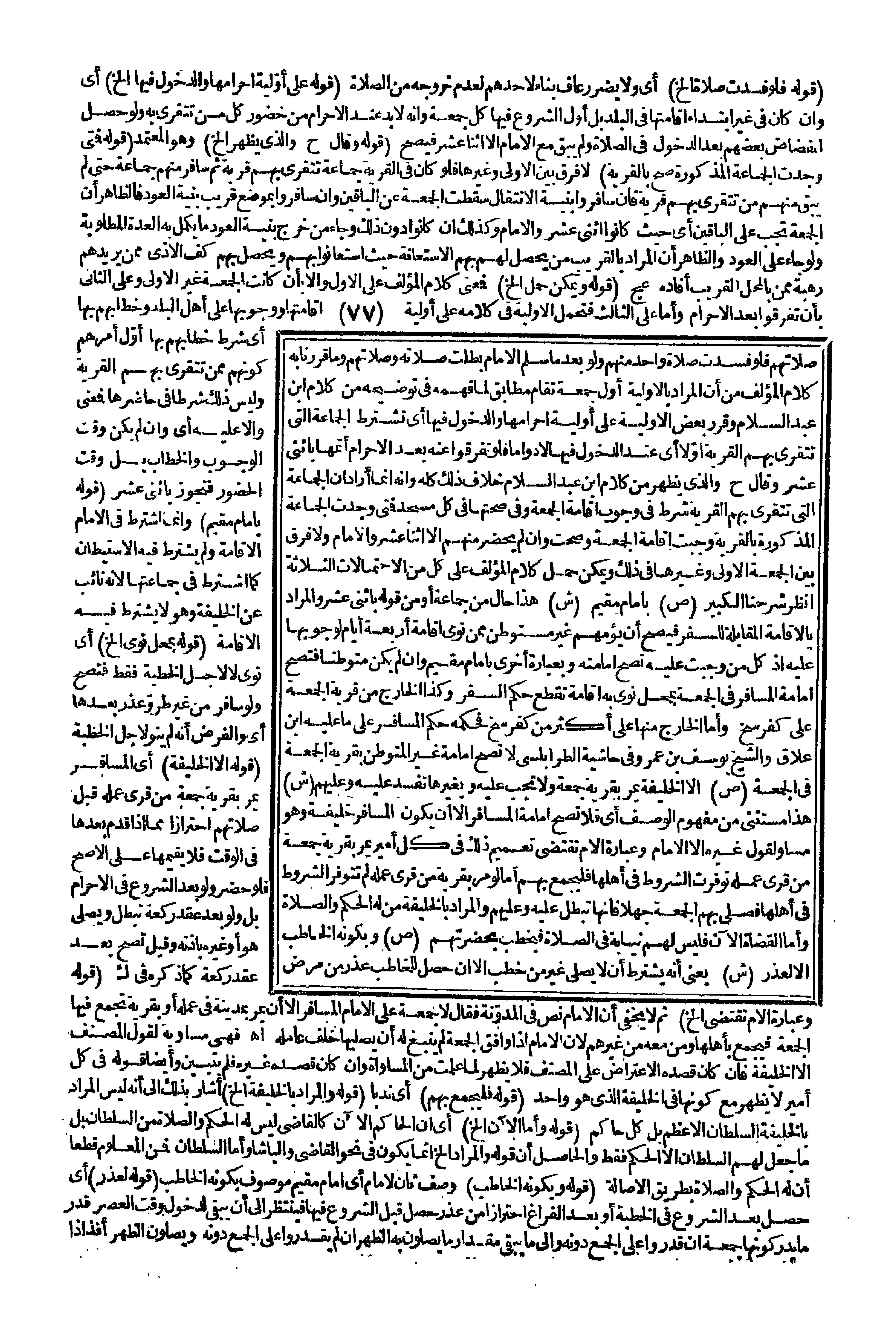 صَلَاتِهِمْ فَلَوْ فَسَدَتْ صَلَاةُ وَاحِدٍ مِنْهُمْ وَلَوْ بَعْدَ مَا سَلَّمَ الْإِمَامُ بَطَلَتْ صَلَاتُهُ وَصَلَاتُهُمْ، وَمَا قَرَّرْنَا بِهِ كَلَامَ الْمُؤَلِّفِ مِنْ أَنَّ الْمُرَادَ بِالْأَوَّلِيَّةِ أَوَّلُ جُمُعَةٍ تُقَامُ مُطَابِقٌ لِمَا فَهِمَهُ فِي تَوْضِيحِهِ مِنْ كَلَامِ ابْنِ عَبْدِ السَّلَامِ وَقَرَّرَ بَعْضٌ الْأَوَّلِيَّةَ عَلَى أَوَّلِيَّةِ إحْرَامِهَا وَالدُّخُولِ فِيهَا أَيْ تُشْتَرَطُ الْجَمَاعَةُ الَّتِي تَتَقَرَّى بِهِمْ الْقَرْيَةُ أَوَّلًا أَيْ عِنْدَ الدُّخُولِ فِيهَا لَا دَوَامًا فَلَوْ تَفَرَّقُوا عَنْهُ بَعْدَ الْإِحْرَامِ أَتَمَّهَا بِاثْنَيْ عَشَرَ وَقَالَ ح وَاَلَّذِي يَظْهَرُ مِنْ كَلَامِ ابْنِ عَبْدِ السَّلَامِ خِلَافُ ذَلِكَ كُلِّهِ وَأَنَّهُ إنَّمَا أَرَادَ أَنَّ الْجَمَاعَةَ الَّتِي تَتَقَرَّى بِهِمْ الْقَرْيَةُ شَرْطٌ فِي وُجُوبِ إقَامَةِ الْجُمُعَةِ وَفِي صِحَّتِهَا فِي كُلِّ مَسْجِدٍ فَمَتَى وُجِدَتْ الْجَمَاعَةُ الْمَذْكُورَةُ بِالْقَرْيَةِ وَجَبَتْ إقَامَةُ الْجُمُعَةِ وَصَحَّتْ وَإِنْ لَمْ يَحْضُرْ مِنْهُمْ إلَّا اثْنَا عَشَرَ وَالْإِمَامُ وَلَا فَرْقَ بَيْنَ الْجُمُعَةِ الْأُولَى وَغَيْرِهَا فِي ذَلِكَ وَيُمْكِنُ حَمْلُ كَلَامِ الْمُؤَلِّفِ عَلَى كُلٍّ مِنْ الِاحْتِمَالَاتِ الثَّلَاثَةِ اُنْظُرْ شَرْحَنَا الْكَبِيرَ