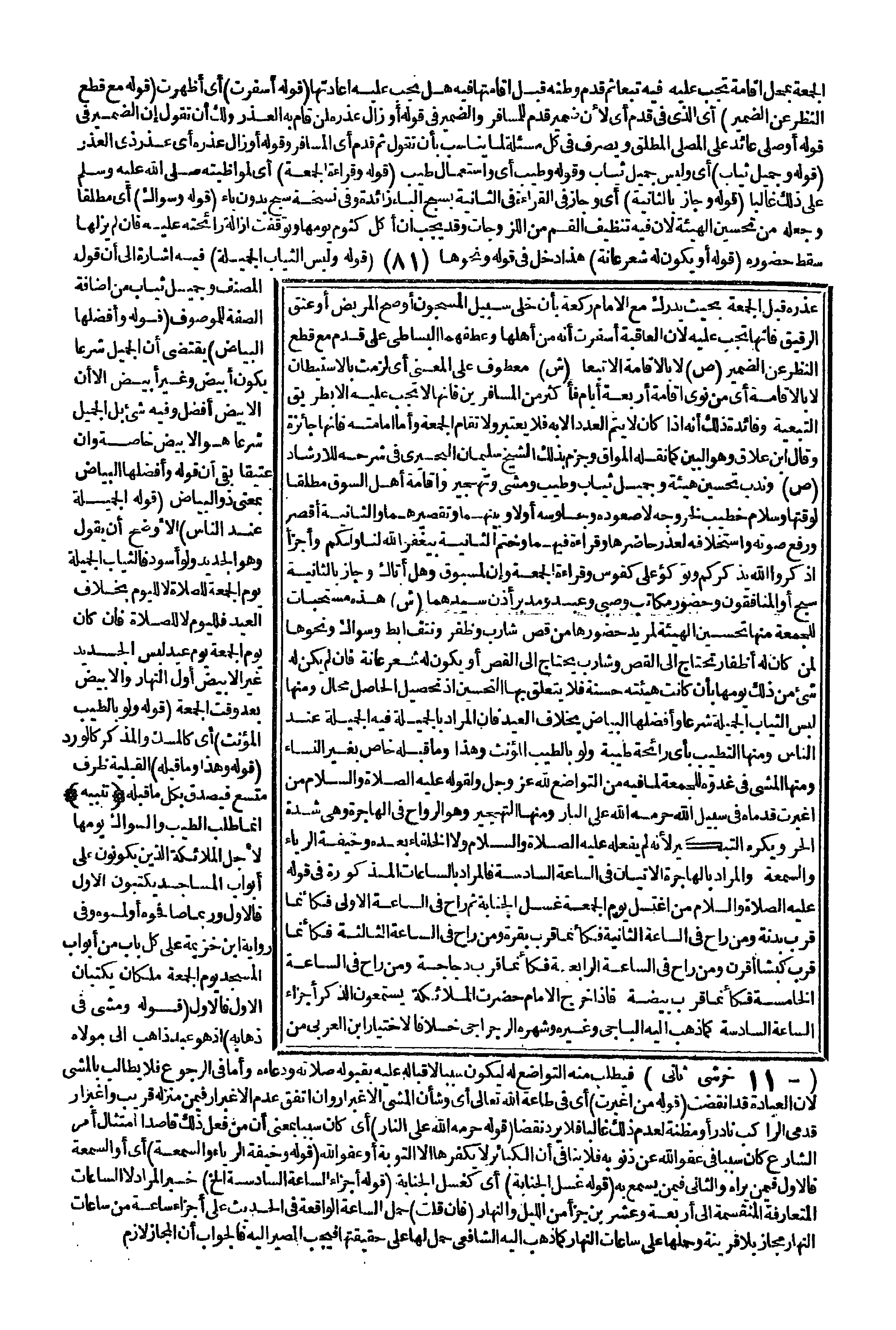 فَالْمُرَادُ بِالسَّاعَاتِ الْمَذْكُورَةِ فِي قَوْلِهِ - عَلَيْهِ الصَّلَاةُ وَالسَّلَامُ - «مَنْ اغْتَسَلَ يَوْمَ الْجُمُعَةِ غُسْلَ الْجَنَابَةِ، ثُمَّ رَاحَ فِي السَّاعَةِ الْأُولَى فَكَأَنَّمَا قَرَّبَ بَدَنَةً وَمَنْ رَاحَ فِي السَّاعَةِ الثَّانِيَةِ فَكَأَنَّمَا قَرَّبَ بَقَرَةً وَمَنْ رَاحَ فِي السَّاعَةِ الثَّالِثَةِ فَكَأَنَّمَا قَرَّبَ كَبْشًا أَقْرَنَ وَمَنْ رَاحَ فِي السَّاعَةِ الرَّابِعَةِ فَكَأَنَّمَا قَرَّبَ دَجَاجَةً وَمَنْ رَاحَ فِي السَّاعَةِ الْخَامِسَةِ فَكَأَنَّمَا قَرَّبَ بَيْضَةً فَإِذَا خَرَجَ الْإِمَامُ حَضَرَتْ الْمَلَائِكَةُ يَسْتَمِعُونَ الذِّكْرَ» أَجْزَاءَ السَّاعَةِ السَّادِسَةِ كَمَا ذَهَبَ إلَيْهِ الْبَاجِيُّ وَغَيْرُهُ وَشَهَرَهُ الرَّجْرَاجِيُّ خِلَافًا لِاخْتِيَارِ ابْنِ الْعَرَبِيِّ مِنْ