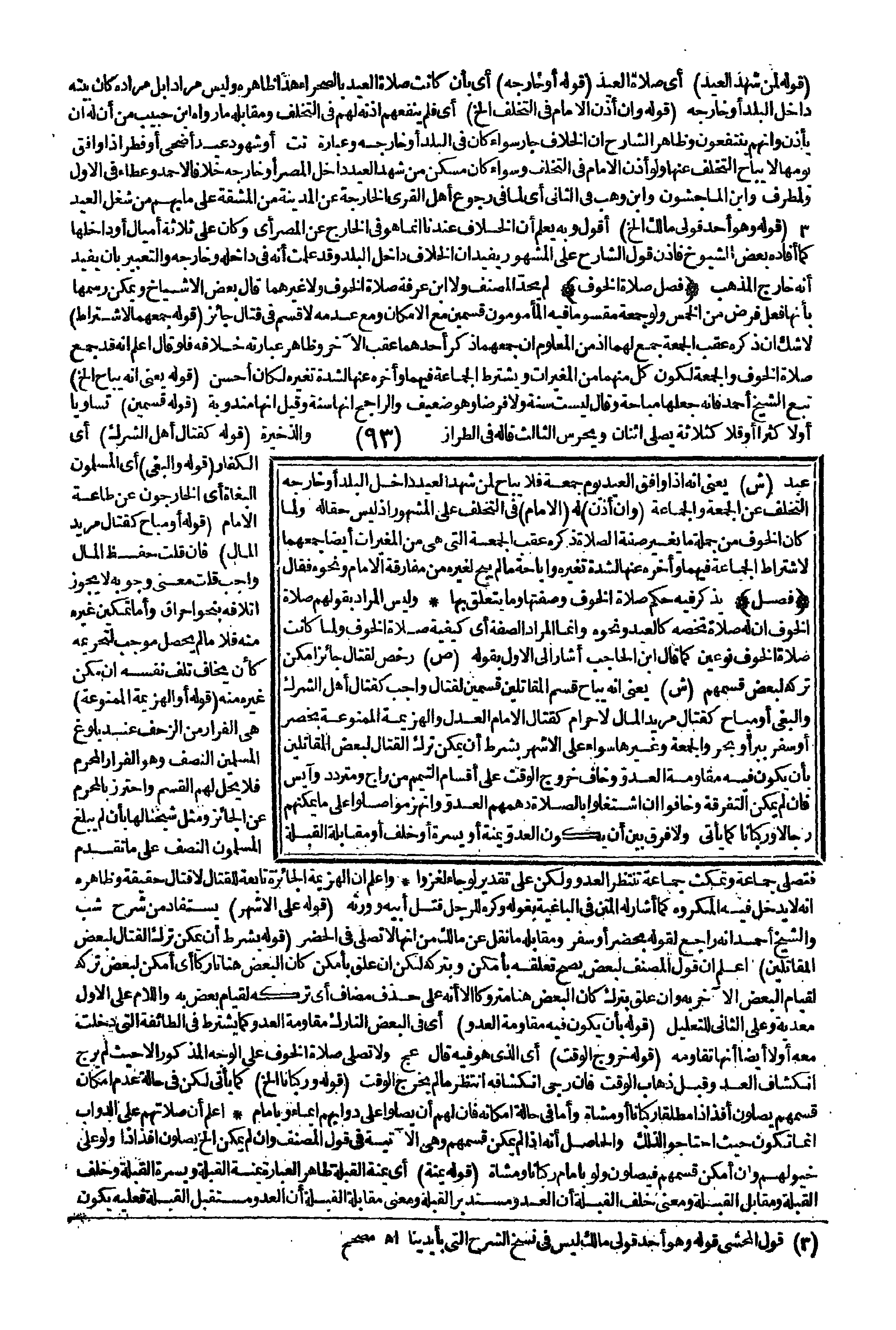 لَمْ يَحُدَّ الْمُصَنِّفُ وَلَا ابْنُ عَرَفَةَ صَلَاةَ الْخَوْفِ وَلَا غَيْرُهُمَا قَالَ بَعْضُ الْأَشْيَاخِ وَيُمْكِنُ رَسْمُهَا بِأَنَّهَا فِعْلُ فَرْضٍ مِنْ الْخَمْسِ وَلَوْ جُمُعَةً مَقْسُومًا فِيهِ الْمَأْمُومُونَ قِسْمَيْنِ مَعَ الْإِمْكَانِ وَمَعَ عَدَمِهِ لَا قِسْمٌ فِي قِتَالٍ جَائِزٍ (قَوْلُهُ جَمَعَهُمَا لِاشْتِرَاطِ. . .) لَا شَكَّ أَنَّ ذِكْرَهُ عَقِبَ الْجُمُعَةِ جَمْعٌ لَهُمَا إذْ مِنْ الْمَعْلُومِ أَنَّ جَمْعَهُمَا ذِكْرُ أَحَدِهِمَا عَقِبَ الْآخَرِ وَظَاهِرُ عِبَارَتِهِ خِلَافُهُ فَلَوْ قَالَ: اعْلَمْ أَنَّهُ قَدْ جَمَعَ صَلَاةَ الْخَوْفِ وَالْجُمُعَةِ لِكَوْنِ كُلٍّ مِنْهُمَا مِنْ الْمُغَيِّرَاتِ وَيُشْتَرَطُ الْجَمَاعَةُ فِيهِمَا وَأَخَّرَهُ عَنْهَا لِشِدَّةِ تَغَيُّرِهِ لَكَانَ أَحْسَنَ (قَوْلُهُ: يَعْنِي أَنَّهُ يُبَاحُ. . . إلَخْ) تَبِعَ الشَّيْخَ أَحْمَدَ فَإِنَّهُ جَعَلَهَا مُبَاحَةً وَقَالَ لَيْسَتْ سُنَّةً وَلَا فَرْضًا وَهُوَ ضَعِيفٌ، وَالرَّاجِحُ أَنَّهَا سُنَّةٌ، وَقِيلَ إنَّهَا مَنْدُوبَةٌ (قَوْلُهُ قِسْمَيْنِ) تَسَاوَيَا أَوْ لَا كَثُرَا أَوْ قَلَّا كَثَلَاثَةٍ يُصَلِّي اثْنَانِ وَيَحْرُسُ الثَّالِثُ قَالَهُ فِي الطِّرَازِ وَالذَّخِيرَةِ (قَوْلُهُ كَقِتَالِ أَهْلِ الشِّرْكِ) أَيْ الْكُفَّارِ (قَوْلُهُ: وَالْبَغْيِ) أَيْ الْمُسْلِمُونَ الْبُغَاةُ أَيْ الْخَارِجُونَ عَنْ طَاعَةِ الْإِمَامِ.