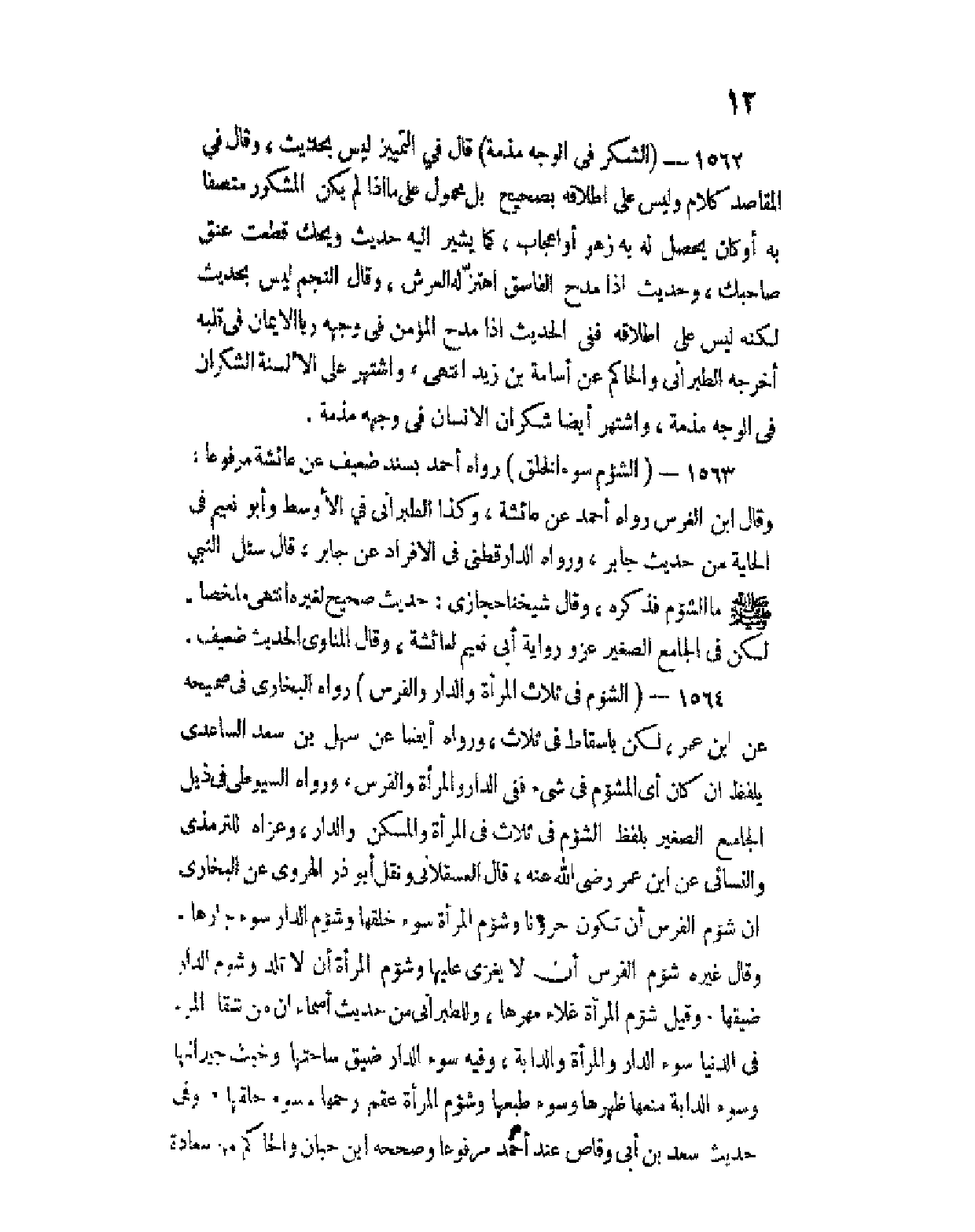 رواه البخاري في صحيحه عن ابن عمر، لكن بإسقاط في ثلاث، ورواه أيضا عن سهل بن سعد الساعدي بلفظ إن كان أي المشؤم في شئ ففي الدار والمرأة، والفرس، ورواه السيوطي في ذيل الجامع الصغير بلفظ الشؤم في ثلاث: في المرأة، والمسكن، والدار، وعزاه للترمذي والنسائي عن ابن عمر رضي الله عنه، قال العسقلاني ونقل أبو ذر الهروي عن البخاري إن شؤم الفرس أن تكون حرونا، وشؤم المرأة سوء خلقها، وشؤم الدار سوء جارها، وقال غيره شؤم الفرس أن لا يغزى عليها، وشؤم المرأة أن لا تلد، وشؤم الدار ضيقها، وقيل شؤم المرأة غلاء مهرها، وللطبراني من حديث أسماء: إن من شقاء المرء في الدنيا سوء الدار، والمرأة، والدابة، وفيه: سوء الدار ضيق ساحتها وخبث جيرانها، وسوء الدابة منعها ظهرها وسوء طبعها، وشؤم المرأة عقم رحمها وسوء خلقها، وفي حديث سعد بن أبي وقاص عند أحمد مرفوعا وصححه ابن حبان والحاكم: من سعادة