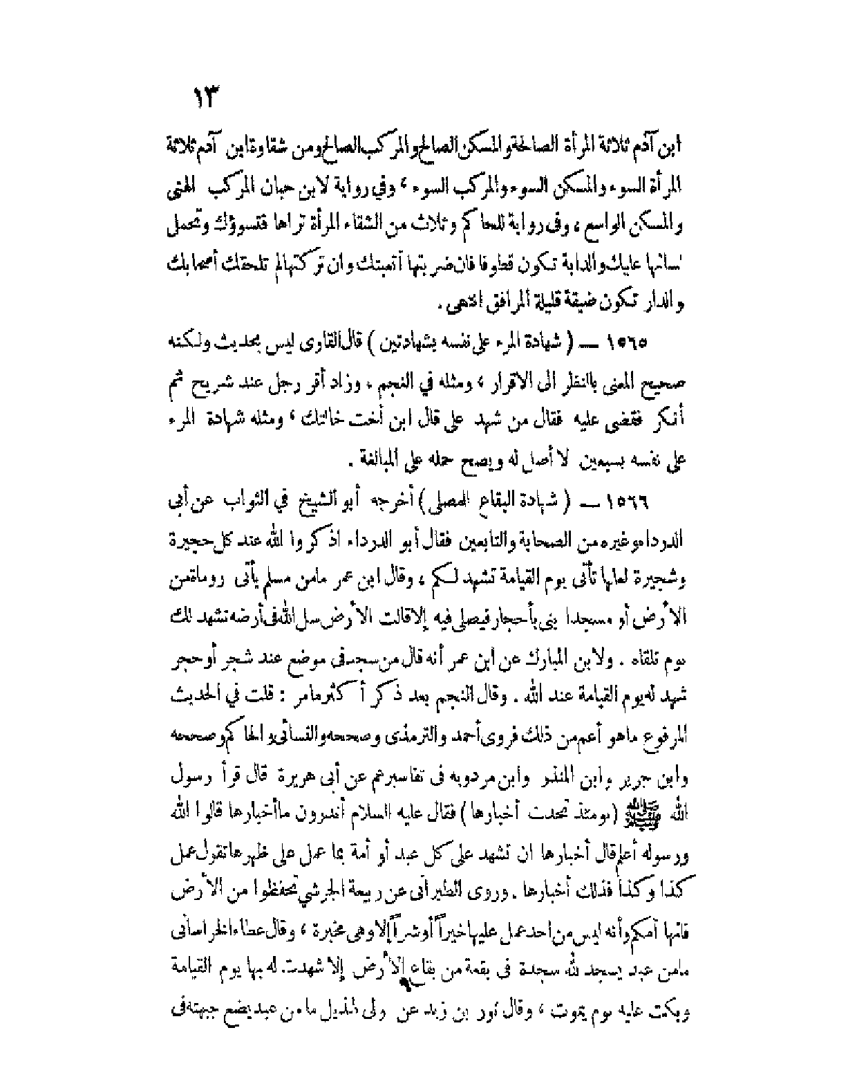 وقال النجم بعد ذكر أكثر ما مر: قلت في الحديث المرفوع ما هو أعم من ذلك، فروى أحمد والترمذي وصححه، والنسائي والحاكم وصححه وابن جرير وابن المنذر وابن مردويه في تفاسيرهم عن أبي هريرة قال قرأ رسول الله صلى الله عليه وسلم ... (يومئذ تحدث أخبارها) ... فقال عليه السلام أتدرون ما أخبارها؟ قالوا الله ورسوله أعلم قال أخبارها أن تشهد على كل عبد أو أمة بما عمل على ظهرها، تقول عمل كذا وكذا فذلك أخبارها، وروى الطبراني عن ربيعة الجرشي تحفظوا من الأرض فإنها أمكم، وأنه ليس من أحد عمل عليها خيرا أو شرا إلا وهي مخبرة، وقال عطاء الخرساني ما من عبد يسجد لله سجدة في بقعة من بقاع الأرض إلا شهدت له بها يوم القيامة، وبكت عليه يوم يموت، وقال ثور بن زيد عن مولى لهذيل: ما من عبد يضع جبهته في