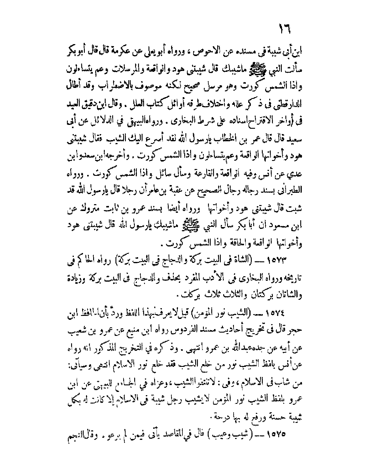 ورواه أيضا بسند عمرو بن ثابت متروك عن ابن مسعود أن أبا بكر سأل النبي صلى الله عليه وسلم ما شيبك يا رسول الله، قال شيبتني هود وأخواتها الواقعة والحاقة وإذا الشمس كورت.