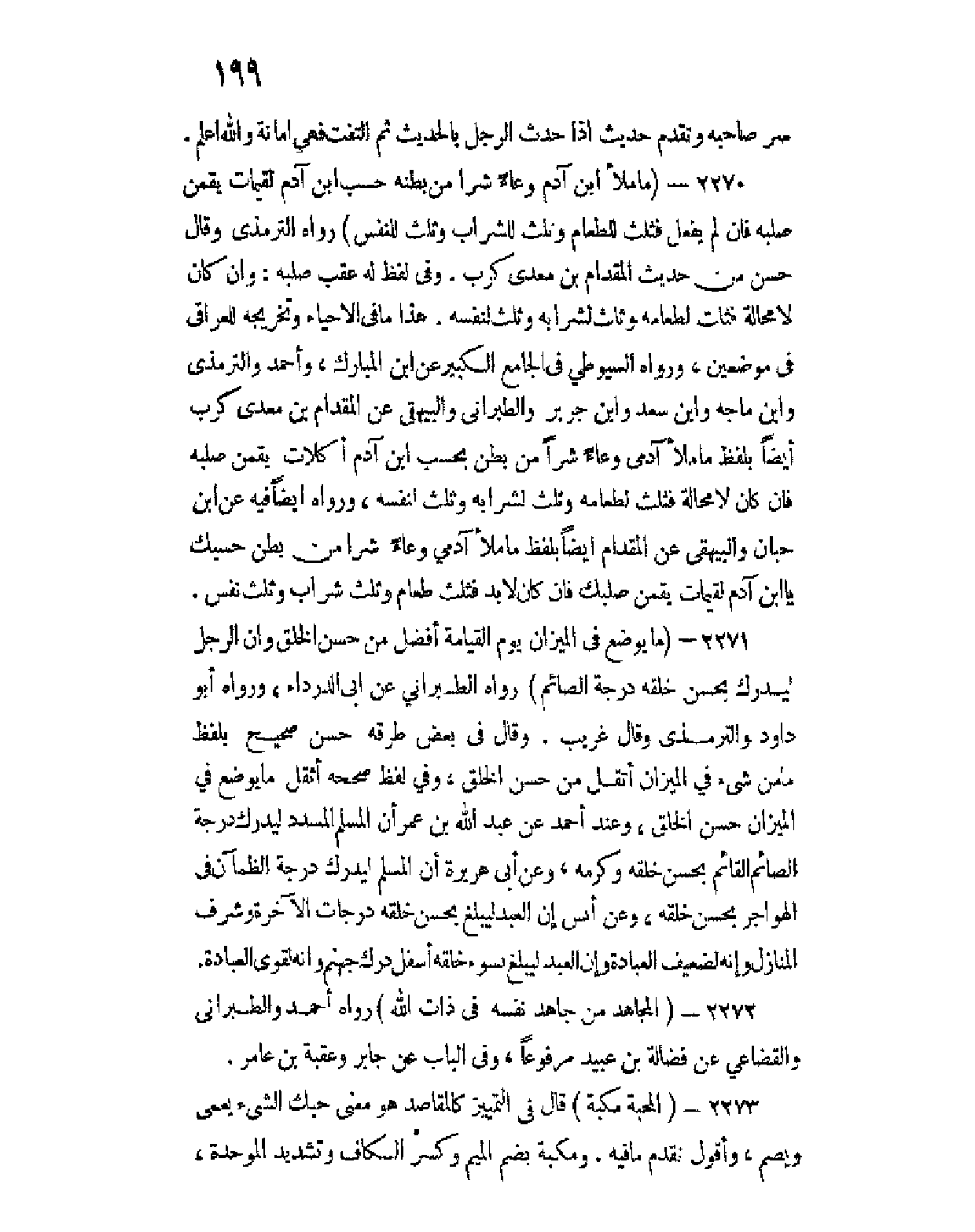 2270 - ما ملأ ابن آدم وعاء شرا من بطنه حسب ابن آدم لقيمات يقمن صُلبه فإلم يفعل فثلث للطعام وثلث للشراب وثلث للنفس.