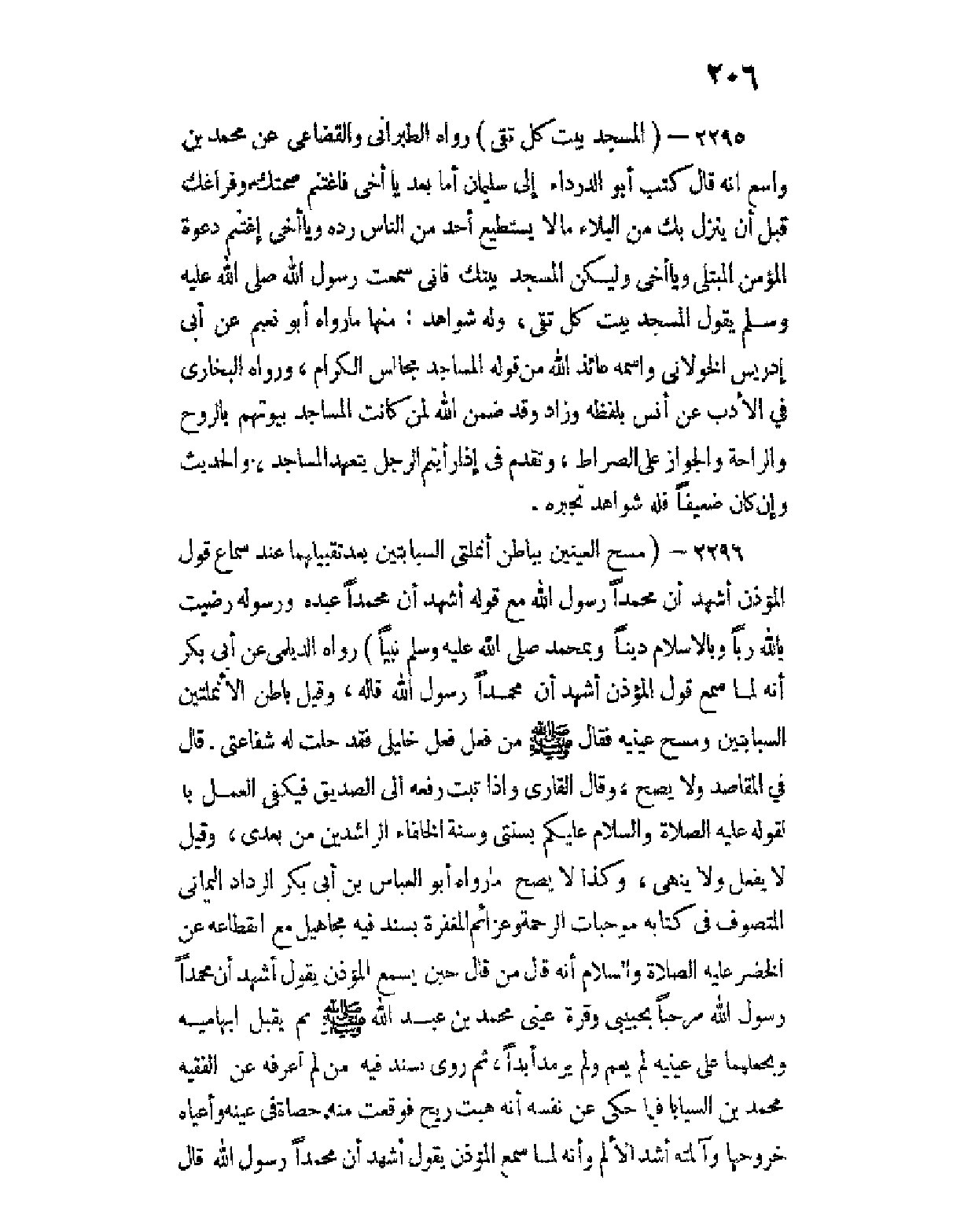 رواه الطبراني والقضاعي عن محمد بن واسع أنه قال كتب أبو الدرداء إلى سليمان أما بعد يا أخي فاغتنم صحتك وفراغك قبل أن ينزل بك من البلاء ما لا يستطيع أحد من الناس رده ويا أخي اغتنم دعوة المؤمن المبتلىَ ويا أخي ولك المسجد بيتك فإني سمعت رسول الله صلى الله عليه وسلم يقول المسجد بيت كل تقي وله شواهد: منها ما رواه أبو نعيم عن أبي إدريس الخولاني واسمه عائذ الله من قوله المساجد مجالس الكرام، ورواه البخاري في الأدب عن أنس بلفظه وزاد وقد ضمن الله لمن كانت المساجد بيوتهم بالروح والراحة والجواز على الصراط، وتقدم في إذا رأيتم الرجل يتعهد المساجد، والحديث وإن كان ضعيفا فله شواهد تجبره.