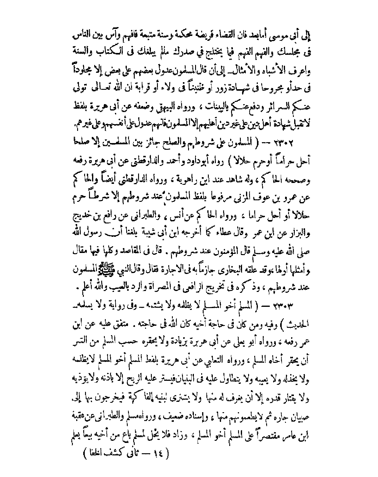 2302 - المسلمون على شروطهم والصلح جائز بين المسلمين إلا صلحا أحل حراما أو حرم حلالا.