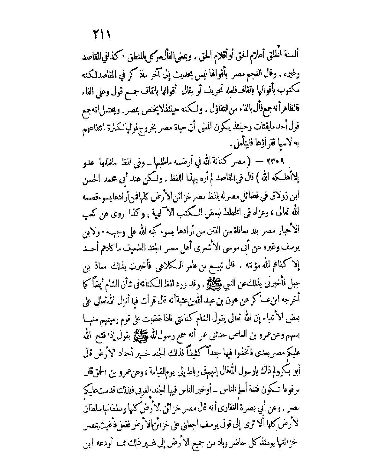 ولكن عند أبي محمد الحسن بن زولاق في فضائل مصر له بلفظ مصر خزائن الأرض كلها فمن أرادها بسوء قصمه الله تعالى، وعزاه في الخطط لبعض الكتب الإلهية، وكذا روي عن كعب الأحبار مصر بلد معفاة من الفتن مَن أرادها بسوء كبه الله على وجهه.