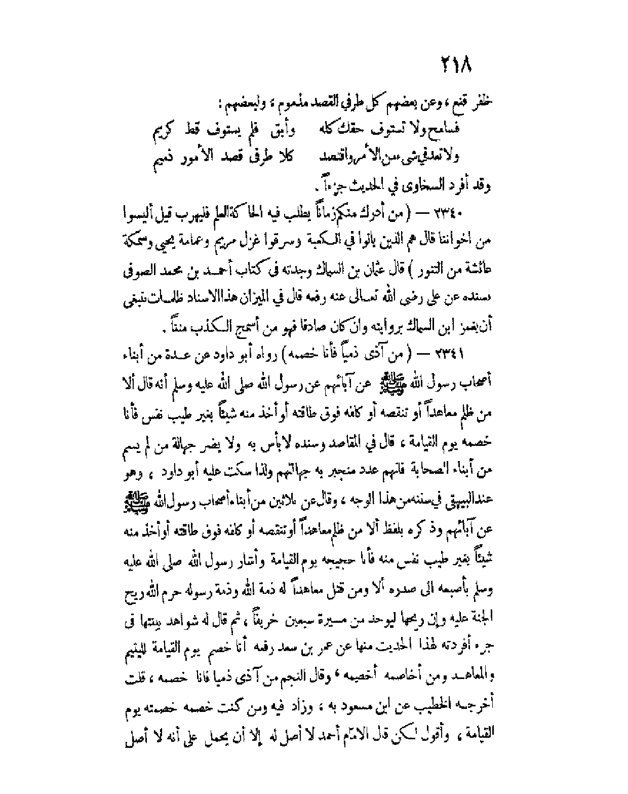 رواه أبو داود عن عدة من أبناء أصحاب رسول الله صلى الله عليه وسلم عن آبائهم عن رسول الله صلى الله عليه وسلم أنه قال ألا من ظلم معاهدا أو تنقصه أو كلفة فوق طاقته أو أخذ منه شيئا بغير طيب نفس فأنا خصمه يوم القيامة، قال في المقاصد وسنده لا بأس به ولا يضر جهالة من لم يسم من أبناء الصحابة فإنهم عدد منجبر به جهالتهم ولذا سكت عليه أبو داود، وهو عند البيهقي في سننه من هذا الوجه، وقال عن ثلاثين من أبناء أصحاب رسول الله صلى الله عليه وسلم عن آبائهم وذكره بلفظ ألا من ظلم معاهدا أو تنقصه أو كلفة فوق طاقته أو أخذ منه شيئا بغير طيب نفس منه فأنا حجيجه يوم القيامة وأشار رسول الله صلى الله عليه وسلم بأصبعه إلى صدره ألا ومن قتل معاهدا له ذمة الله وذمة رسوله حرم الله ريح الجنة عليه وإن ريحها ليوجد من مسيرة سبعين خريفا، ثم قال له شواهد بينتها في جزء أفردته لهذا الحديث منها عن عمر بن سعد رفعه أنا خصم يوم القيامة لليتيم والمعاهد ومن أخاصمه أخصمه، وقال النجم من آذى ذميا فأنا خصمه، قلت أخرجه الخطيب عن ابن مسعود به، وزاد فيه ومن كنت خصمه خصمته يوم القيامة، وأقول لكن قال الإمام أحمد لا أصل له إلا أن يحمل على أنه لا أصل
