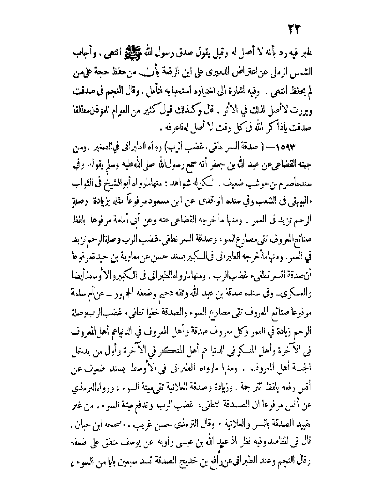 وقال الترمذي حسن غريب، وصححه ابن حبان قال في المقاصد وفيه نظر إذ عبد الله بن عيسى راويه عن يوسف متفق على ضعفه، وقال النجم وعند الطبراني عن رافع بن خديج الصدقة تسد سبعين بابا من السوء