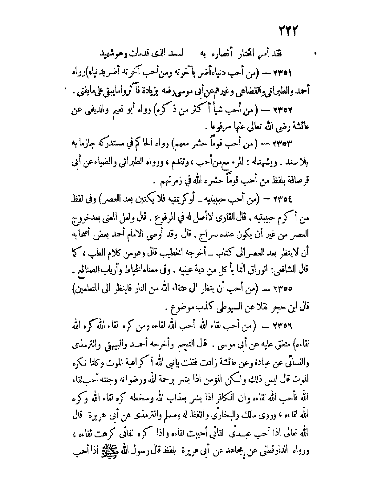 قال النجم وأخرجه أحمد والبيهقي والترمذي والنسائي عن عبادة وعن عائشة زادت: فقلت: يا نبي الله أكراهية الموت، وكلنا نكره الموت؟ قال: ليس ذلك ولكن المؤمن إذا بشر برحمة الله ورضوانه وجنته أحب لقاء الله فأحب الله لقاءه، وإن الكافر إذا بشر بعذاب الله وسخطه كره لقاء الله وكره الله لقاءه.