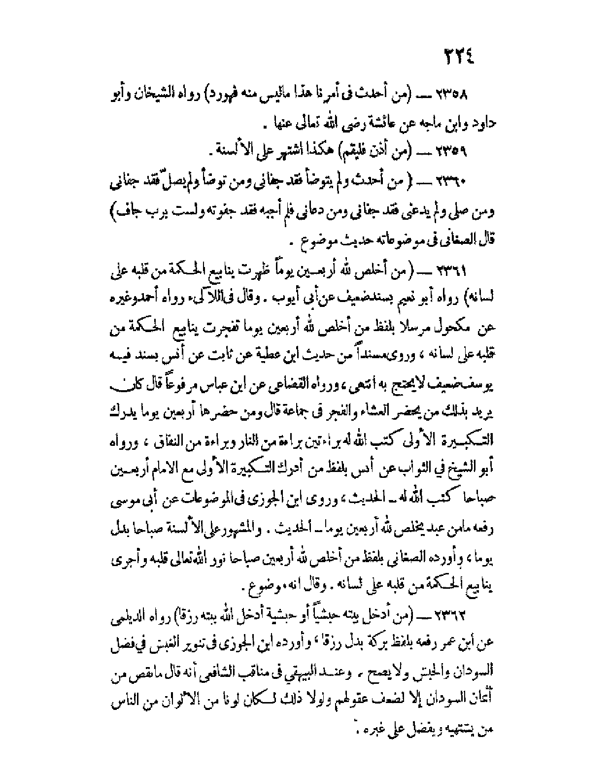 والمشهور على الألسنة صباحا بدل يوما، وأورده الصغاني بلفظ من أخلص لله أربعين صباحا نور الله تعالى قلبه وأجرى ينابيع الحكمة من قلبه على لسانه.