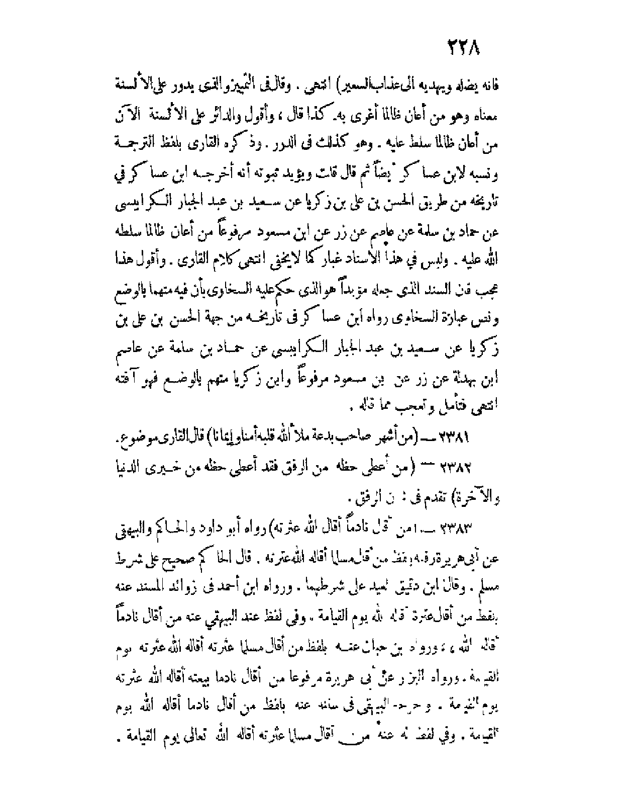 ونص عبارة السخاوي رواه ابن عساكر في تاريخه من جهة الحسن بن علي بن زكريا عن سعيد بن عبد الجبار الكرابيسي عن حماد بن سلمة عن عاصم بن بهدلة عن زر عن ابن مسعود مرفوعا وابن زكريا متهم بالوضع فهو آفته انتهى فتأمل وتعجب مما قاله.