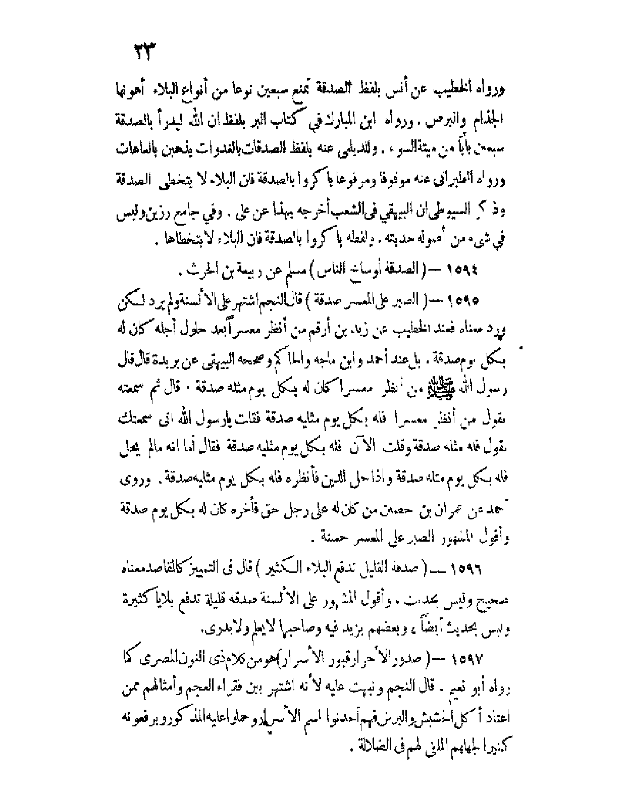 قال في التمييز كالمقاصد معناه صحيح، وليس بحديث، وأقول المشهور على الألسنة صدقة قليلة تدفع بلايا كثيرة، وليس بحديث أيضا، وبعضهم يزيد فيه: وصاحبها لا يعلم ولا يدري.