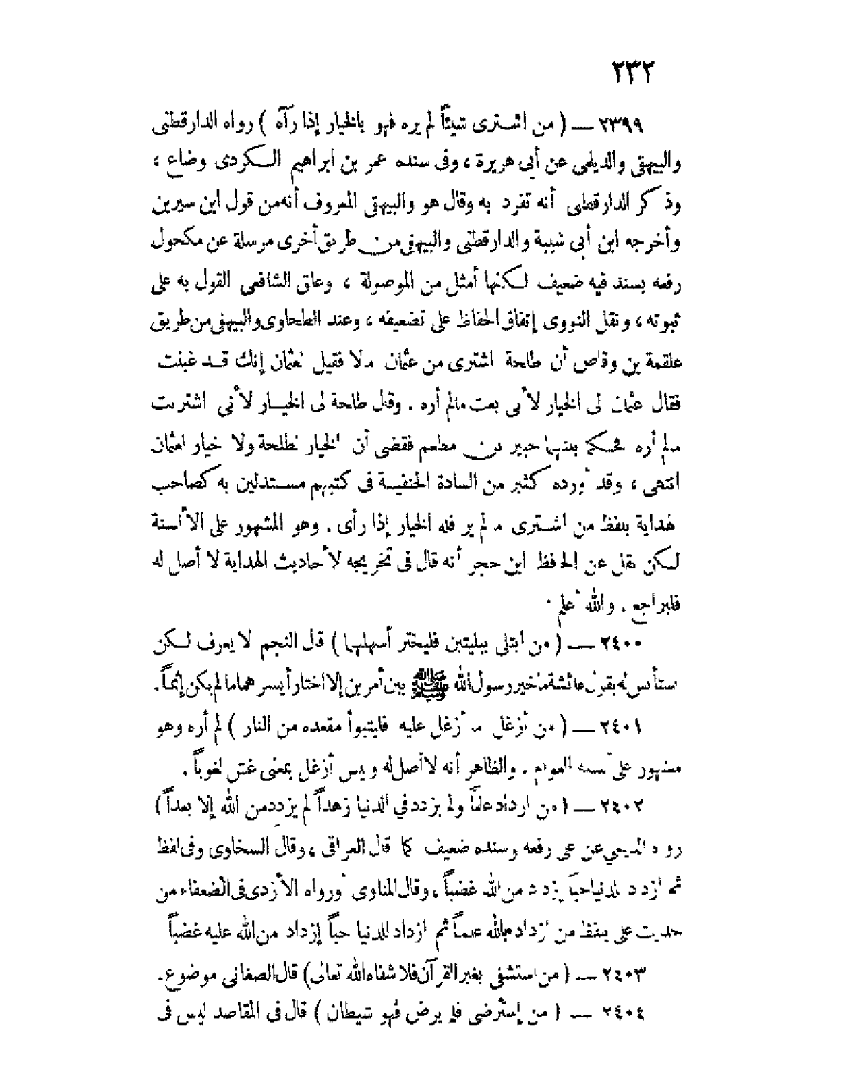 2399 - من اشترى شيئا لم يره فهو بالخيار إذا رآه رواه الدارقطني والبيهقي والديلمي عن أبي هريرة، وفي سنده عمر عن إبراهيم الكردي وضاع، وذكر الدارقطني أنه تفرد به وقال هو والبيهقي المعروف أنه من قول ابن سيرين وأخرجه ابن أبي شيبة والدارقطني والبيهقي من طريق أخرى مرسلة عن مكحول رفعه بسند فيه ضعيف لكنها أمثل من الموصولة، وعلق الشافعي القول به على ثبوته، ونقل النووي اتفاق الحفاظ على تضعيفه، وعند الطحاوي والبيهقي من طريق علقمة بن وقاص أن طلحة اشترى من عثمان مالا فقيل لعثمان إنك قد غبنت فقال عثمان لي الخيار لأني بعت ما لم أره.
