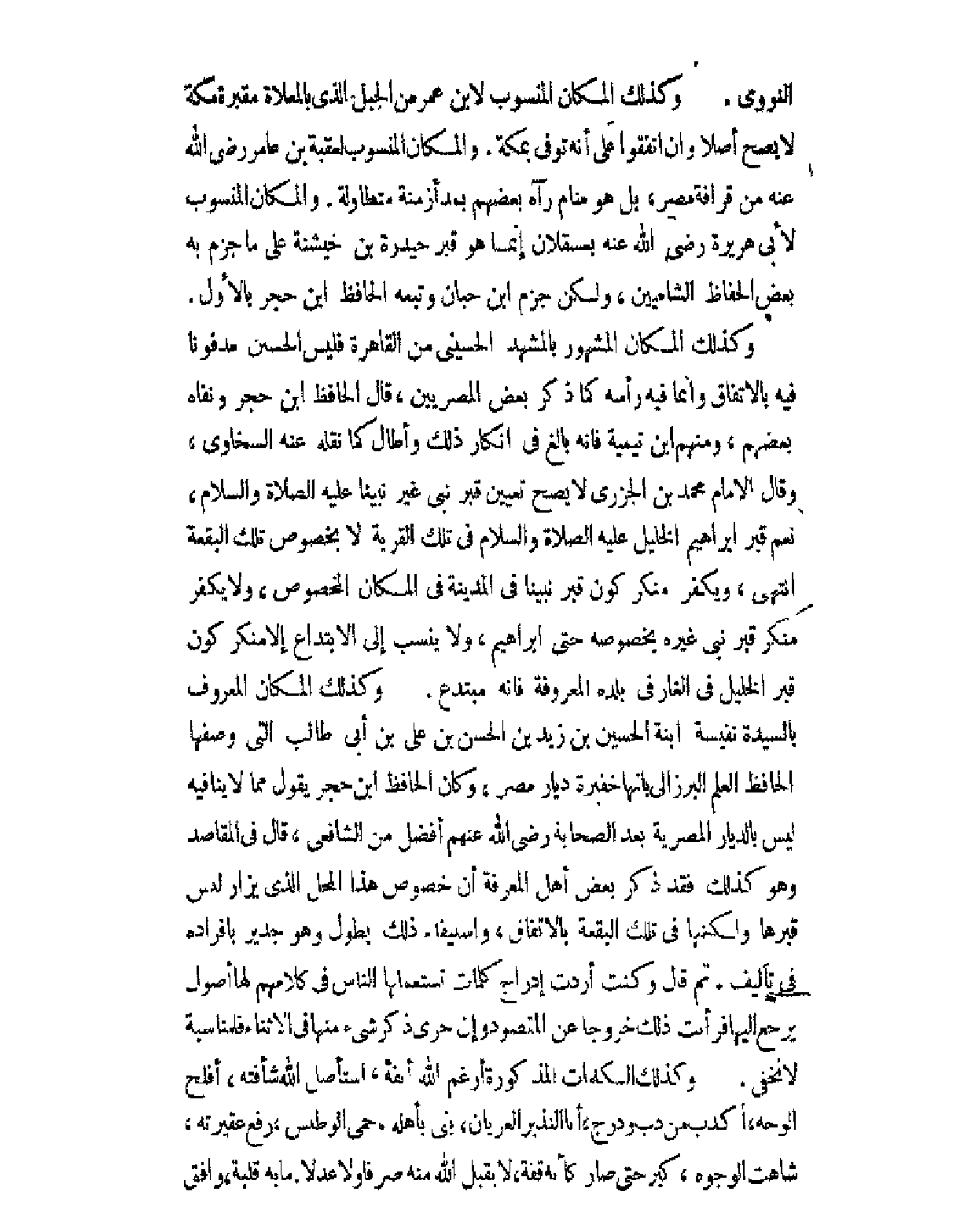 وكذلك المكان المشهور بالمشهد الحسيني من القاهرة فليس الحسين مدفونا فيه بالاتفاق وإنما فيه رأسه كما ذكر بعض المصريين، قال الحافظ ابن حجر ونفاه بعضهم، ومنهم ابن تيمية فإنه بالغ في إنكار ذلك وأطال كما نقله عنه السخاوي.