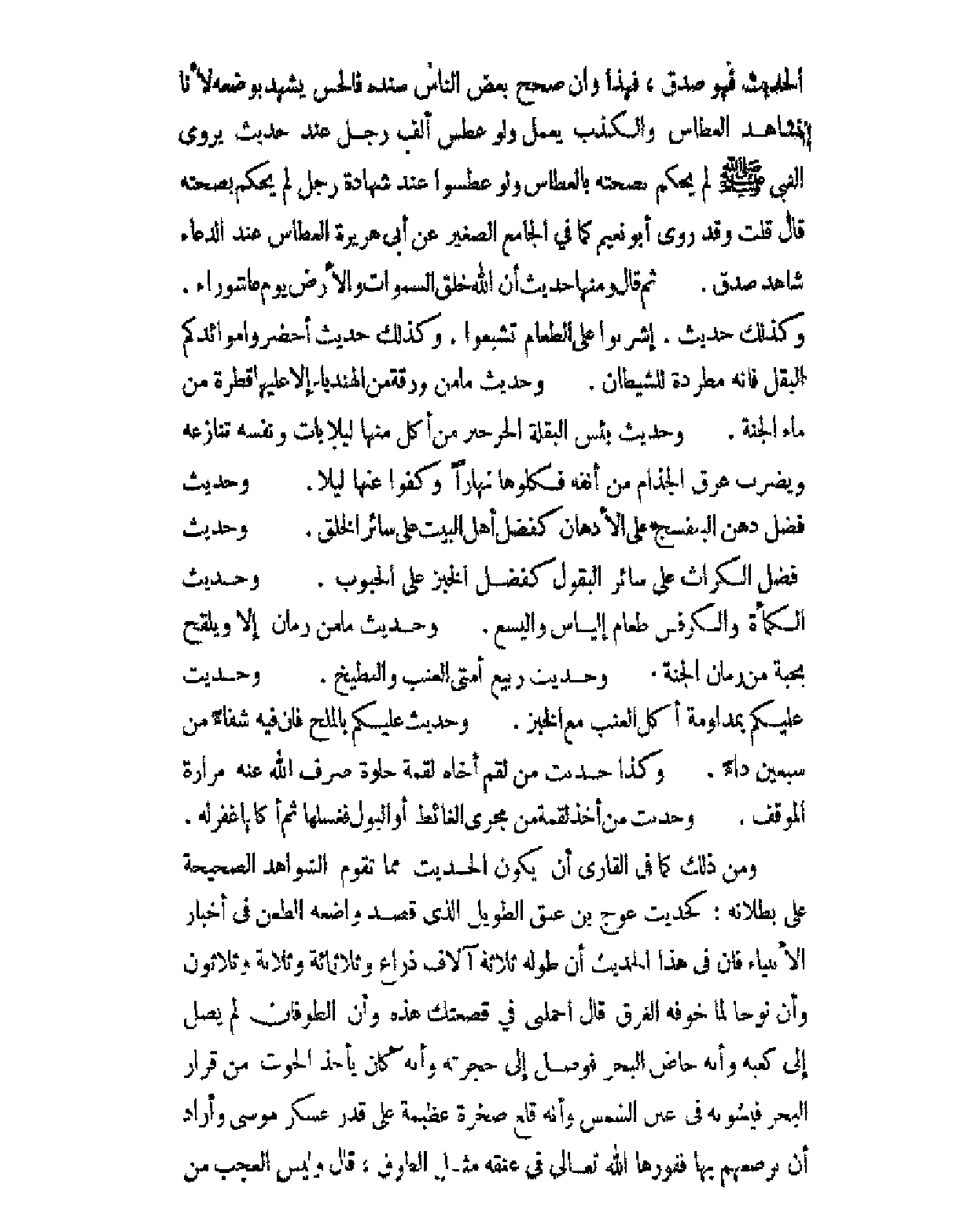 ومن ذلك كما في القاري أن يكون الحديث مما تقوم الشواهد الصحيحة على بطلانه كحديث عوج بن عنق الطويل الذي قصد واضعه الطعن في أخبار الأنبياء فإن في هذا الحديث أن طوله ثلاثة آلاف ذراع وثلاثمائة وثالثة وثلاثون وأن نوحا لما خوفه الغرق قال: احماني في قصعتك هذه وأن الطوفان لم يصل إلى كعبه وأنه خاض البحر فوصل إلى حجرته وأنه كان يأخذ الحوت من قرار البحر فيشويه في عين الشمس وأنه قلع صخرة عظيمة على قدر عسكر موسى وأراد أن يرصعهم بها فقورها الله تعالى في عنقه مثل الطوق.