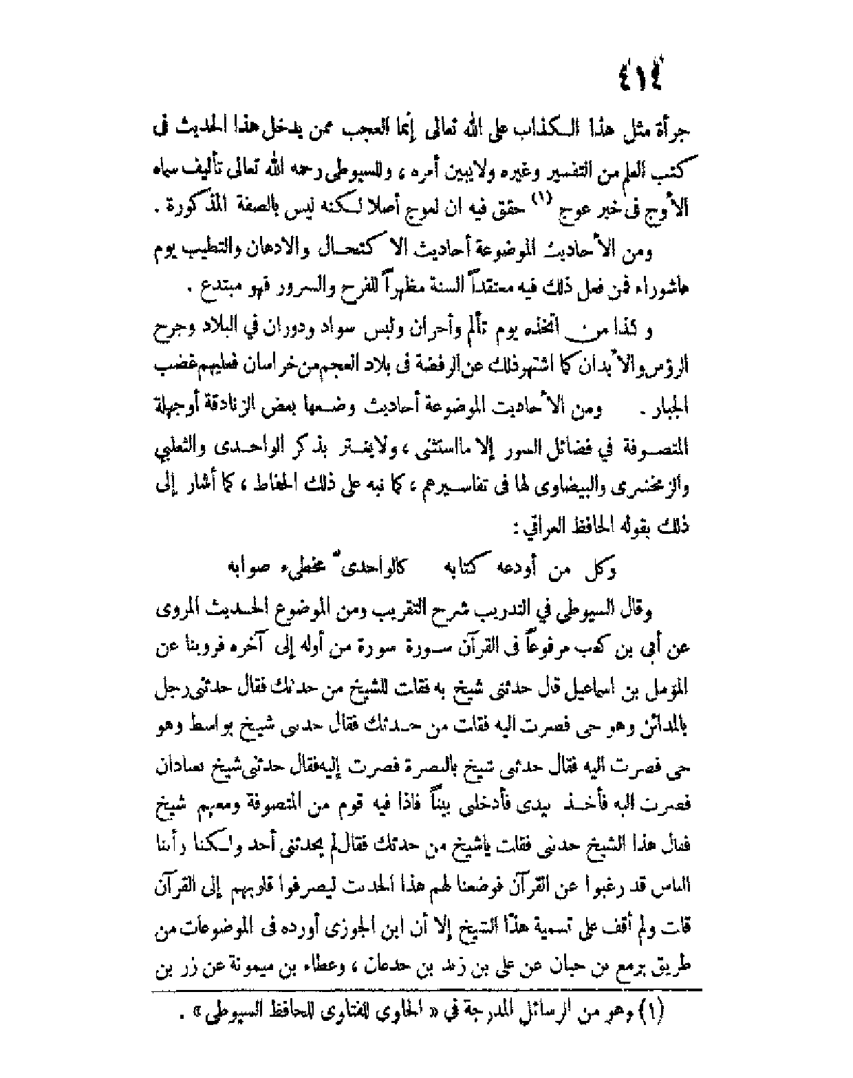 ومن الأحاديث الموضوعة أحاديث وضعها بعض الزنادقة أو جهله المتصوفة في فضائل السور إلا ما استثنى، ولا يغتر بذكر الواحدي والثعلبي والزمخشري والبيضاوي لها في تفاسيرهم، كما نبه على ذلك الحفاظ، كما أشار إلى ذلك بقوله الحافظ العراقي: وكا من أودعه كتابه ... كالواحدي مخطئ صوابه وقال السيوطي في التدريب شرح التقريب: ومن الموضوع الحديث المروي عن أبي بن كعب مرفوعا في القرآن سورة سورة من أوله إلى آخره فروينا عن المؤمل بن اسماعيل قال: حدثني شيخ به، فقلت للشيخ من حدثك؟ فقال: حدثني رجل بالمدائن وهو حي فصرت إليه فقلت: من حدثك؟ فقال: حدثني شيخ بواسط وهو حي فصرت إليه فقال حدثني شيخ بالبصرة فصرت إليه فقال: حدثني شيخ بعبادان فصرت إليه فأخذ بيدي فأدخلني بيتا فإذا فيه قوم من المتصوفة ومعهم شيخ فقال هذا الشيخ حدثني فقلت يا شيخ من حدثك فقال: لم يحدثني أحد ولكنا رأينا الناس قد رغبوا عن القرآن فوضعنا لهم هذا الحديث ليصرفوا قلوبهم إلى القرآن.