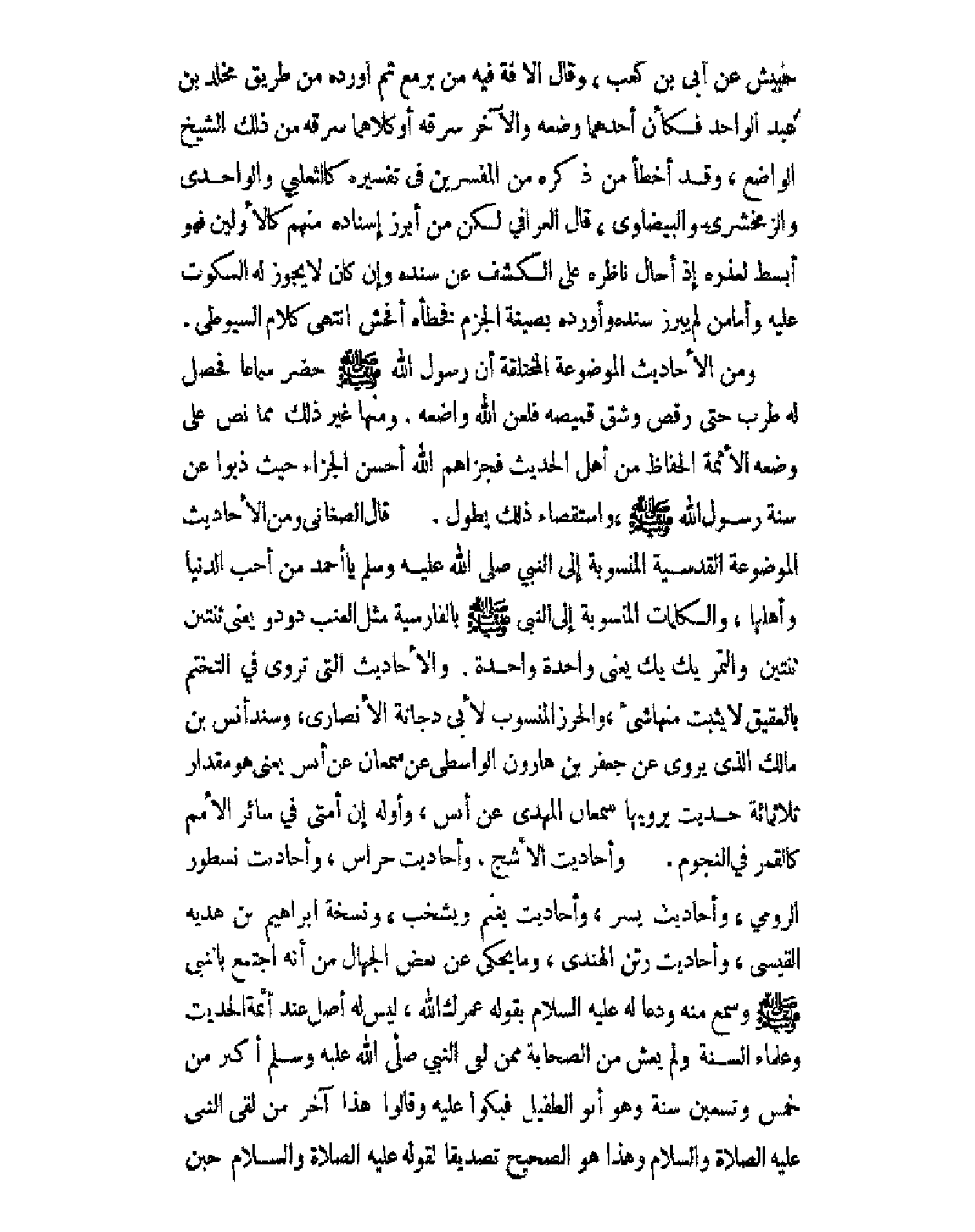 والكلمات المنسوبة إلى النبي صلى الله عليه وسلم بالفارسية مثل: العنب دودو يعني ثنتين ثنتين والتمر يك يك يعني واحدة واحدة والأحاديث التي تروى في التختم بالعقيق لا يثبت منها شئ، والحرز المنسوب لأبي دجانة الأنصاري، وسند أنس بن مالك الدي يروي عن جعفر بن هارون الواسطي عن سمعان عن أنس يعني هو مقدار ثلاثمائة حديث يرويها سمعان المهدي عن أنس، وأوله: إن أمتي في سائر الأمم كالقمر في النجوم.