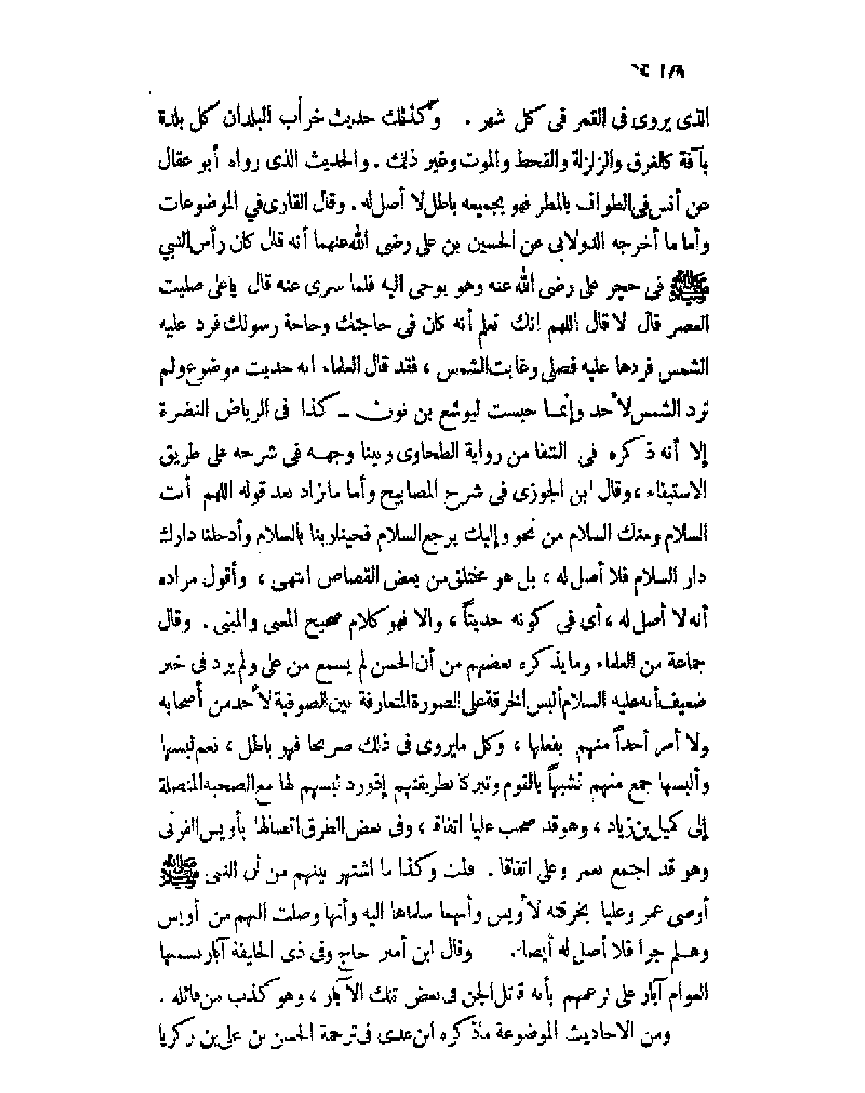 وقال القاري في الموضوعات وأما ما أخرجه الدولابي عن الحسين بن علي رضي الله عنهما أنه قال: كان رأس النبي صلى الله عليه وسلم في حجر علي رضي الله عنه وهو يوحى إليه فلما سري عنه قال: يا علي صليت العصر؟ قال: لا.