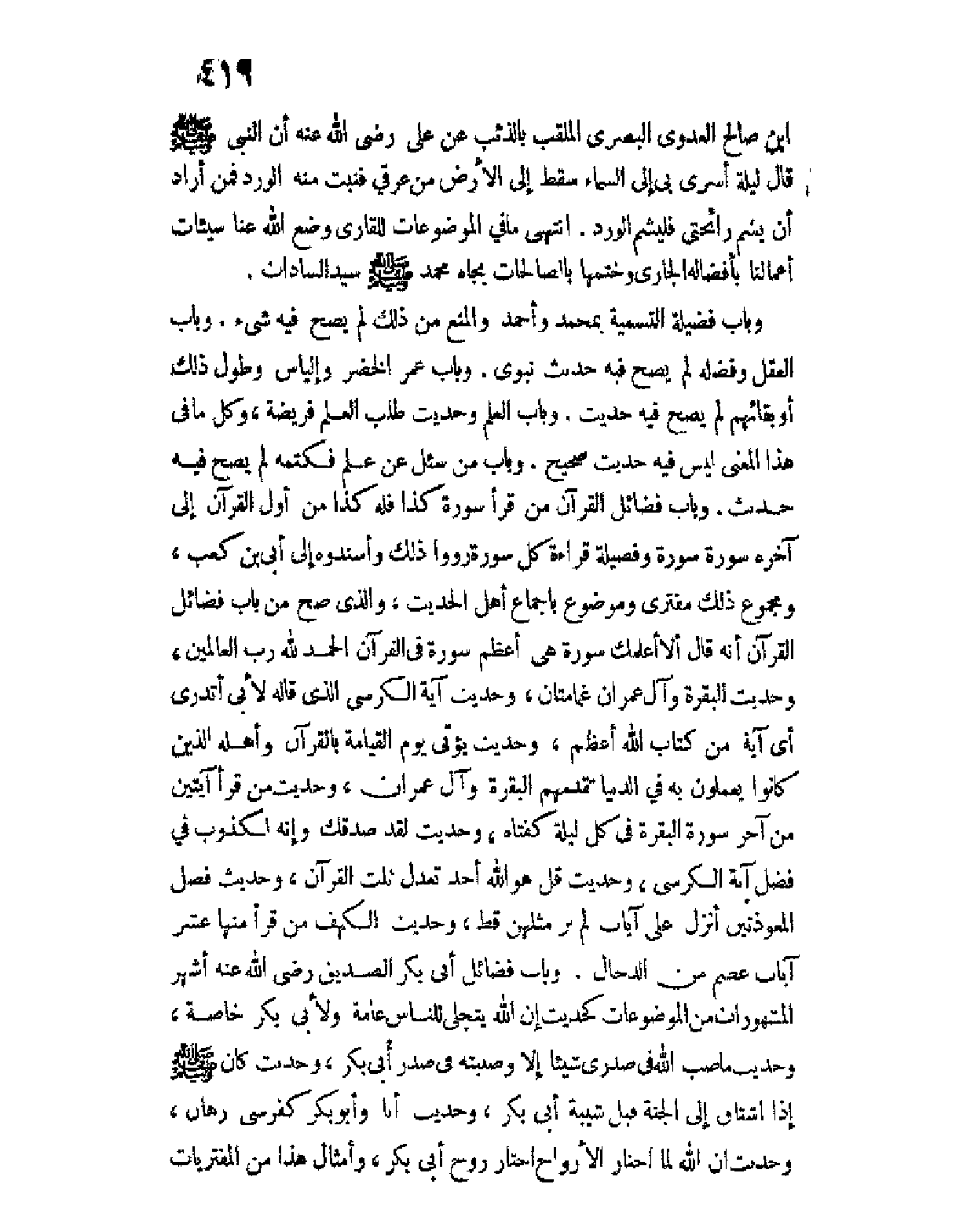 وباب فضائل القرآن من قرأ سورة كذا فله كذا من أول القرآن إلى آخره سورة سورة وفضيلة قراءة كل سورة رووا ذلك وأسندوه إلى أبي بن كعب، ومجموع ذلك مفترى وموضوع بإجماع أهل الحديث.