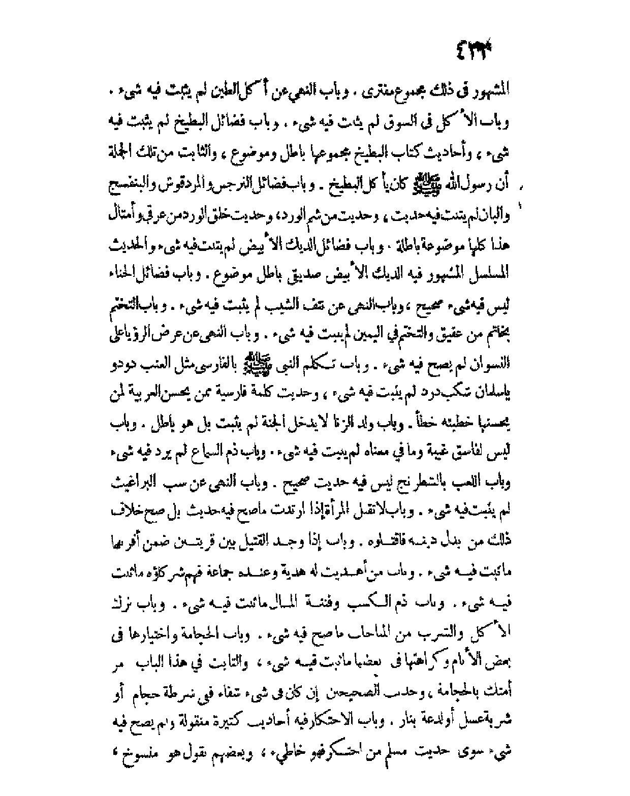 وباب تكلم النبي صلى الله عليه وسلم بالفارسي مثل: العنب دودو يا سلمان شكب درد لم يثبت فيه شئ، وحديث: كلمة فارسية ممن يحسن العربية لمن يحسنها خطبته خطأ.
