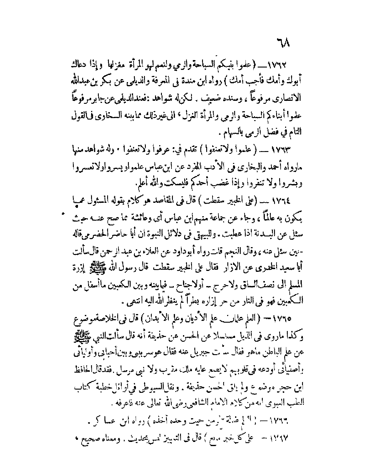وقال النجم في ابن السني وأبو نعيم كلاهما في الطب والحاكم عن ابن مسعود عليكم بألبان البقر فإنها دواء وأسمانها فإنها شفاء، وإياكم ولحومها فإن لحومها داء، ورواه أبو نعيم وابن السني عن صهيب بلفظ عليكم بألبان البقر فإنها شفاء، وسمنها دواء، ولحمها داء.
