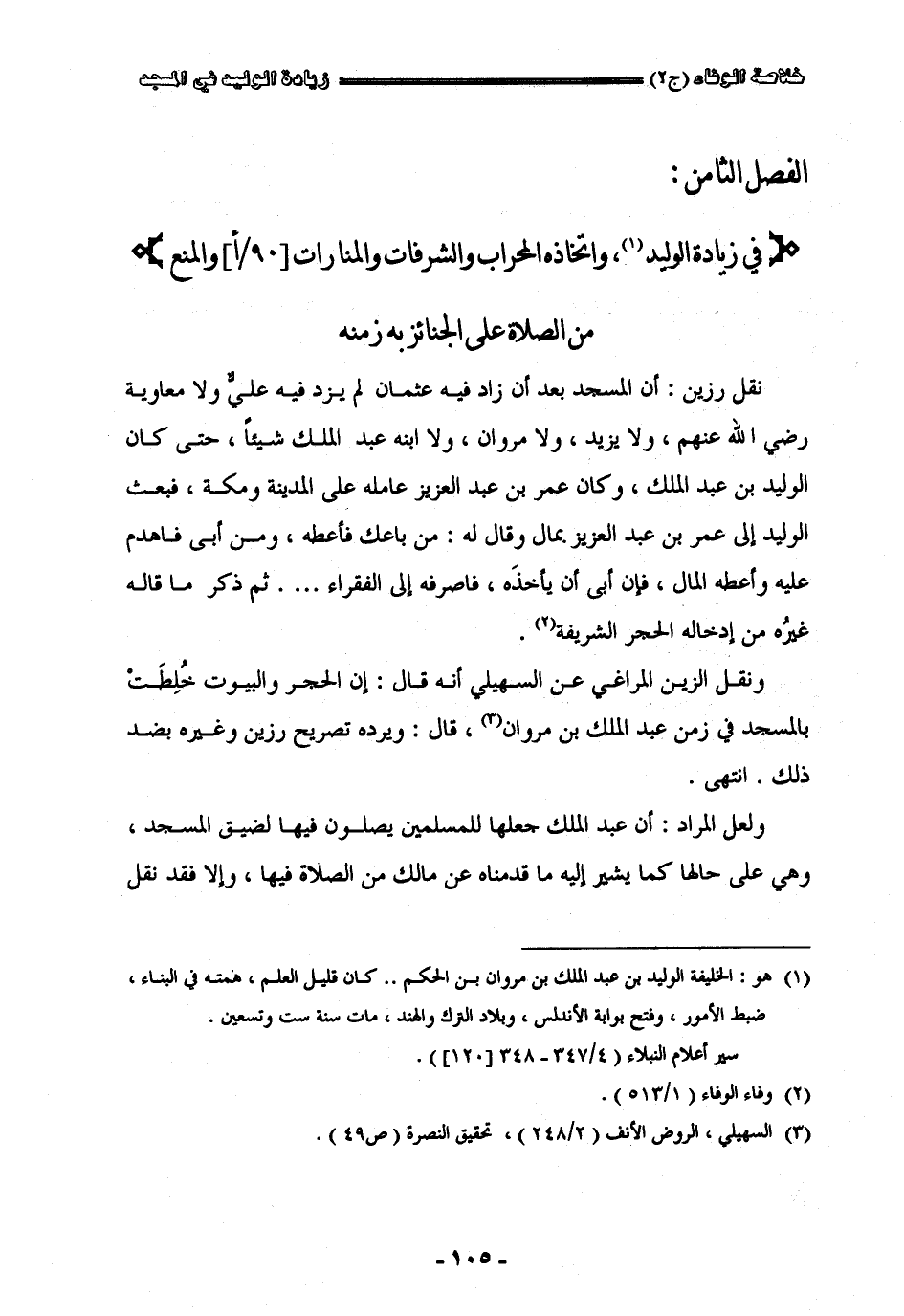 " الفصل الثامن " في زيادة الوليد واتخاذه المحراب والشرفات والمنارات والمنع من الصلاة على الجنائز به زمنه