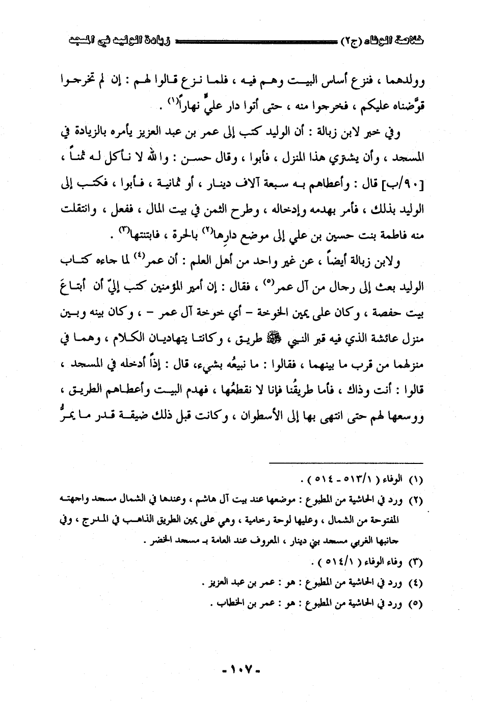 وولدهما فنزع أساس البيت وهم فيه فلما نزع قالوا لهم إن لم تخرجوا قوضناه عليكم فخرجوا منه حتى أتوا دار عليّ نهارا وفي خبر لأبن زبالة إن الوليد كتب إلى عمر بن عبد العزيز يأمره بالزيادة في المسجد وأن يشتري هذا المنزل فأبوا وقال حسن والله لا نأكل له ثمنا قال وأعطاهم به سبعة آلاف دينارا وثمانية فأبوا فكتب للوليد بذلك فأمره بهدمه وإدخاله وطرح الثمن في بيت المال ففعل وانتقلت منه فاطمة بنت حسين بن عليّ إلى موضع دارها بالحرة فابتنتها ولأبن زبالة أيضا عن غير واحد من أهل العلم إن عمر لما جاءه كتاب الوليد بعث إلى رجال من آل عمر فقال إن أمير المؤمنين كتب إليّ أن أبتاع بيت حفصة وكان عن يمين الخوخة أي خوخة آل عمر وكان بينه وبين منزل عائشة الذي فيه قبر النبي صلى الله عليه وسلم طريق وكانتا يتهاديان الكلام وهما في منزلهما من قرب ما بينهما فقالوا ما نبيعه بشيء قال إذا أدخله في المسجد قالوا أنت وذاك فأما طريقنا فإنا لا نقطعها فهدم البيت وأعطاهم الطريق ووسعها لهم حتى انتهى بها إلى الأسطوانة وكانت قبل ذلك ضيقة قدر ما يمرّ