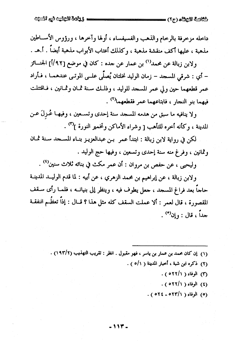 من وزرات الرخام وطراز الذهب والفسيفساء أوّلها وآخرها ورؤس الأساطين مذهبة عليها أكف منقشة مذهبة وكذلك عتاب الأبواب مذهبة أيضا اه ولأبن زبالة عن محمد بن عمار عن جدّه كان في موضع الجنائز أي شرقيّ المسجد زمان الوليد نخلتان يصلي على الموتى عندهما فأراد عمر قطعهما حين ولي عمل المسجد للوليد وذلك سنة ثمان وثمانين فاثتنلت فيهما بنو النجار فابتاعهما عمر فقطعهما ولا ينافيه ما سبق من هدمه المسجد سنة إحدى وتسعين وفيها عزل عن المدينة وكأنه أخره للتأهب لكن في رواية لأبن زبالة ابتدأ عمر بن عبد العزيز بناء المسجد سنة ثمان وثمانين وفرغ منه سنة إحدى وتسعين وفيها حج الوليد وليحيى عن حفص بن مروان أن عمر مكث في بنائه ثلاث سنين ولأبن زبالة عن إبراهيم بن محمد الزهريّ عن أبيه لما قدم الوليد المدينة حاجا بعد فراغ المسجد جعل يطوف فيه وينظر إلى بنيانه فلما رأى سقف المقصورة قال لعمر ألا عملت السقف كله مثل هذا قال إذا تعظم النفقة جدّا قال وإن