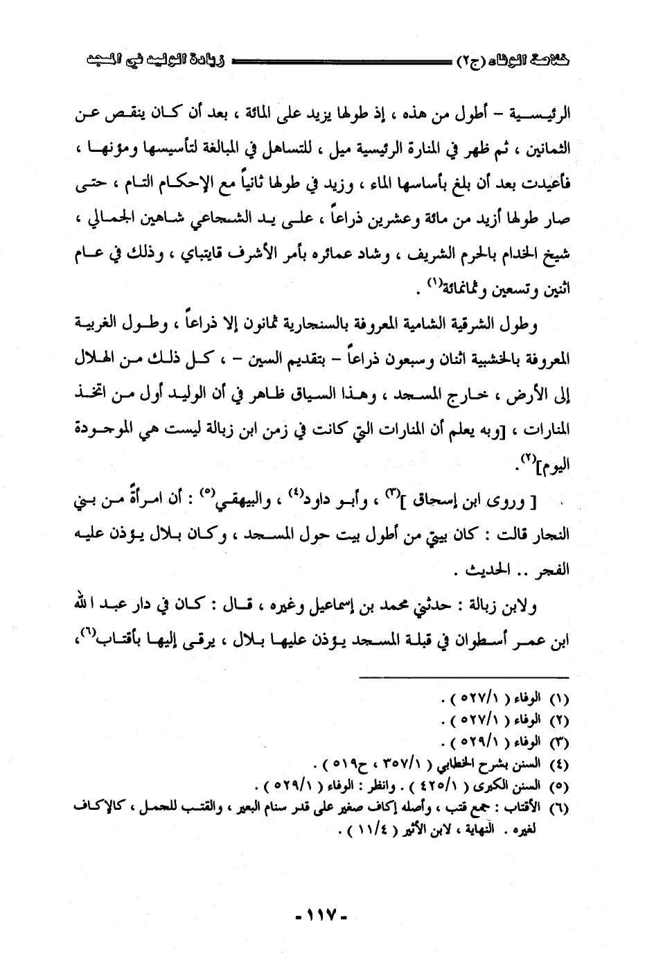 الرسيسة أطول من هذه إذ طولها يزيد على المائة بعد أن كان ينقص عن الثمانين ثم ظهر في المنارة الرسيسة ميل للتساهل في المبالغة لتأسيسها ومؤنها فأعيدت بعد أن بلغ بأساسها الماء وزيد في طولها ثانيا مع الأحكام التام حتى صار طولها أزيد من مائة وعشرين ذراعا على يد الشجاعي شاهين الجمالي شيخ الخدام بالحرم الشريف وشاد عمائره بأمر الإشراف قايتباي وذلك في عام أثنين وتسعين وثمانمائة وطول الشرقية الشامية المعروفة بالسنجارية ثمانون إلا ذراعا وطول الغربية المعروفة بالخشبية اثنان وسبعون ذراعا بتقديم السين كل ذلك من الهلال إلى الأرض خارج المسجد وهذا السياق ظاهر في أن الوليد أوّل من أتخذ المنارات ولأبي داود والبيهقيّ إن امرأة من بني النجار قالت كان بيتي من أطول بيت حول المسجد وكان بلال يؤذن عليه الفجر الحديث ولأبن زبالة حدثني محمد بن إسماعيل وغيره قال كان في دار عبد الله بن عمر أسطوانة في قبلة المسجد يؤذن عليها بلال يرقى إليها بأقتاب