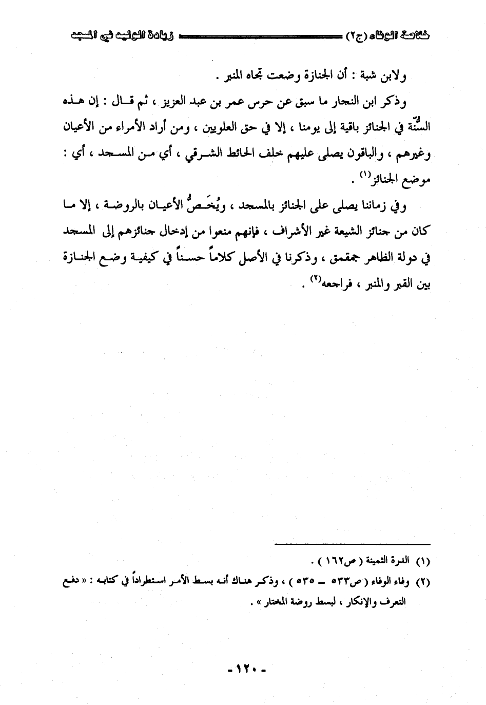ولأبن شبة إن الجنازة وضعت تجاه المنبر وذكر أبن النجار ما سبق عن حرس عمر بن عبد العزيز ثم قال إن هذه السنة في الجنائز باقية إلى يومنا إلا في حق العلو بين ومن أراد الأمراء من الأعيان وغيرهم والباقون يصلي عليهم خلف الحائط الشرقي أي من المسجد أي موضع الجنائز وفي زماننا يصلي على الجنائز بالمسجد ويخص الأعيان بالروضة إلا ما كان من جنائز الشيعة غير الأشراف فأنهم منعوا من إدخال جنائزهم إلى المسجد في دولة جقمق وذكرنا في الأصل كلاما حسنا في كيفية وضع الجنازة بين القبر والمنبر فراجعه.
