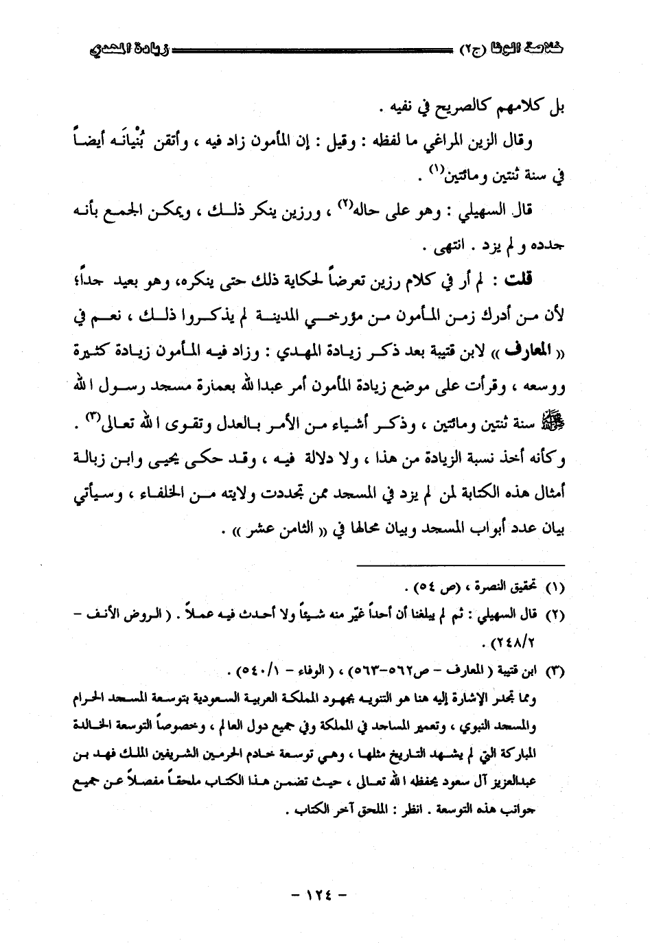 بل كلامهم كالصريح في نفيه وقال الزين المراغي ما لفظه وقيل إن المأمون زاد فيه وأتقن بنيانه أيضا في سنة ثنتين ومائتين قال السهيلي وهو على حاله ورزين ينكره وهو بعيد جداً الآن من أدرك زمن المأمون من مؤرخي المدينة لم يذكروا ذلك نعم في المعارف لأبن قتيبة بعد ذكر زيادة المهدي وزاد فيه المأمون زيادة كثيرة ووسعه وقرأت على موضع زيادة المأمون أمر عبد الله بعمارة مسجد رسول الله صلى الله عليه وسلم سنة ثنتين ومائتين وذكر أشياء من الأمر بالعدل وتقوى الله تعالى وكأنه أخذ نسبة الزيادة من هذا ولا دلالة فيه وقد حكى يحيى وأبن زبالة أمثال هذه الكتابة لمن لم يزد في المسجد