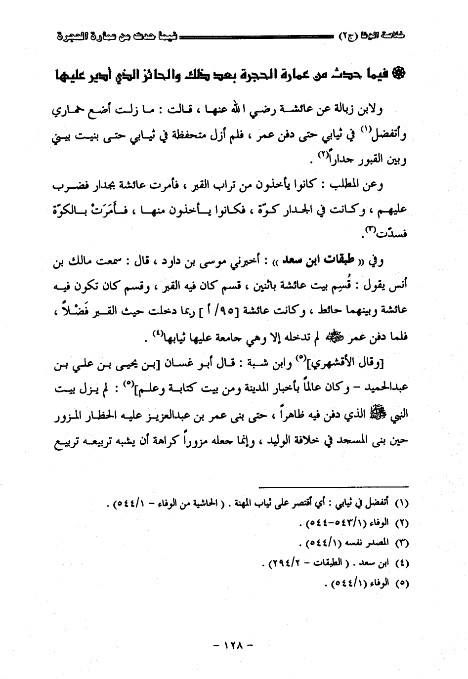 ولأبن زبالة عن عائشة رضي الله عنها قالت ما زلت أضع خماري وأنفصل في ثيابي حتى دفن عمر فلن أزل متحفظة في ثيابي حتى بنيت بيني وبين القبور جدارا وعن عبد المطلب كانوا يأخذون من تراب القبر فأمرت عائشة بجدار فضرب عليهم وكانت في الجدار ركوة فكانوا يأخذون منها فأمرت بالكوة فسدت وفي طبقات ابن سعد أخبرني موسى بن داود قال سمعت مالك بن أنس يقول قسم بيت عائشة باثنين قسم كان فيه القبر وقسم كان تكون فيه عائشة وبينها حائط وكانت عائشة ربما دخلت حيث القبر فلما دفن عمر رضي الله عنه لم تدخله إلا وهي جامعة عليه ثيابها ولأبن شبة عن أبي غسان لم يزل بيت النبي صلى الله عليه وسلم الذي دفن فيه ظاهر حتى بنى عمر بن عبد العزيز عليه الخطار المزور حين بنى المسجد في خلافة الوليد وإنما جعله مزورا كراهة أن يشبه تربيعه تربيع