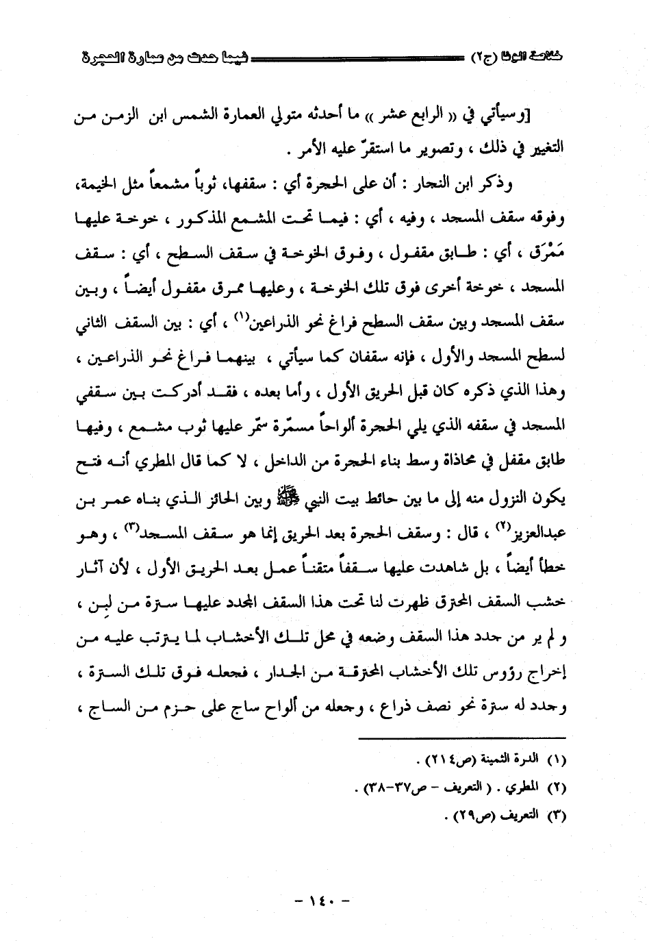 وسيأتي في الرابع عشر ما أحدثه متولي العمارة الشمس بن الزمن من التغيير في ذلك وتصوير ما استقرّ عليه الأمر وذكر أبن النجار أن على الحجرة أي سقفها ثوبا مشمعا مقل الخيمة وفوقه سقف المسجد وفيه أي فيما تحت المشمع المذكور خوخة عليها ممرق أي طابق مقفول وفوق الخوخة في سقف السطح أي سقف المسجد خوخة أخرى فوق تلك الخوخة وعليها ممرق مقفول أيضا وبين سقف المسجد وبين سقف السطح فراغ نحو الذراعين أي بين السقف الثاني لسطح المسجد والأوّل فإنه سقفان كما سيأتي بينهما فراغ نحو الذراعين وهذا الذي ذكره كان قبل الحريق الأوّل وأما بعده فقد أدركت بين سقفي المسجد في سقفه الذي يلي الحجرة ألواحا مسمرة سمر عليها ثوب مشمع وفيها طابق مقفل في محاذاة وسط بناء الحجرة الداخل لا كما قال المطري إنه إذا فتح يكون النزول منه إلى ما بين حائط بيت النبي صلى الله عليه وسلم وبين الحائز الذي بناه عمر بن عبد العزيز قال وسقف الحجرة بعد الحريق إنما هو سقف المسجد وهو خطأ أيضا بل شاهدت عليها سقفا متقنا عمل بعد الحريق الأوّل لأنّ آثار خشب السقف المحترق ظهرت لنا تحت هذا السقف المجدّد عليها سترة من لبن ولم ير من جدّد هذا السقف وضعه في محل تلك الأخشاب لما يترتب عليه من إخراج رؤوس تلك الأخشاب المحترقة من الجدار فجعله فوق تلك السترة وجدّد له سترة نحو نصف ذراع وجعله من ألواح ساج على حزم من الساج
