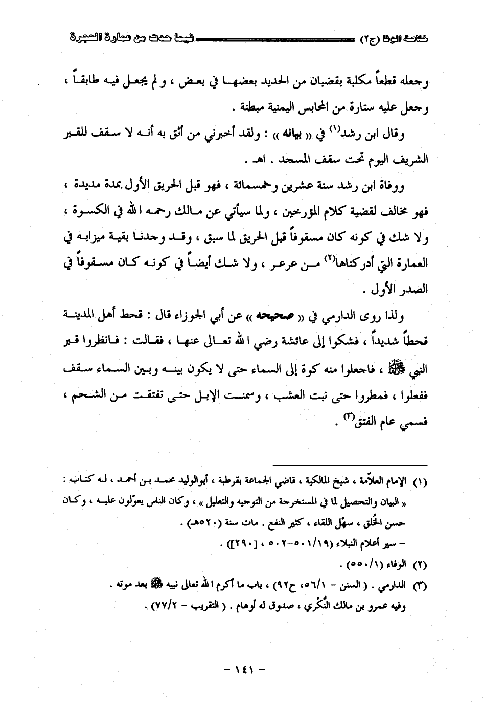 وجعله قطعا مكلبة بقضبان من الحديد بعضها في بعض ولم يجعل فيه طابقا وجعل عليه ستارة من المحابس اليمنية مبطنة وقال أبن رشد في بيانه ولقد أخبرني من أثق به أنه لا سقف للقبر الشريف اليوم تحت سقف المسجد اه ووفاة أبن رشد سنة عشرين وخمسمائة فهو قبل الحريق الأوّل بمدّة مديدة فهو مخالف لقضية كلام المؤرخين ولما سيأتي عن مالك رحمه الله في الكسوة ولا شك في كونه كان مسقوفا قبل الحريق لما سبق وقد وجدنا بقية ميزابه في العمارة التي أدركناها من عرعر ولا شك أيضا في كونه كان مسقوفا في الصدر الأوّل ولذا روى الدارميّ في صحيحه عن أبي الجوزاء قال قحط أهل المدينة قحطا شديدا فشكوا إلى عائشة رضي الله عنه فقالت