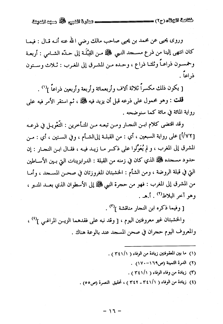 رواية المائة في مائة كما سنوضحه وقد اقتضى كلام ابن النجار ومن تبعه من المتأخرين التعويل في ذرعه على رواية السبعين أي من القبلة إلى الشام وفي السير أي من المشرق إلى المغرب ولم يعّولوا على ذكر ما زيد فيه فقال ابن النجار أن حدود مسجده صلى الله عليه وسلم الذي كان في زمنه من القبلة الدرابزينات التي بين الأساطين التي في قبلة الروضة ومن الشام الخشبتان المغروزتان في صحن المسجد وأما من المشرق إلى المغرب فهو من حجرة النبي صلى الله عليه وسلم إلى الأسطوان الذي بعد المنبر وهو آخر البلاط اه والخشبتان غير معروفتين اليوم والمعروف اليوم حجران في صحن المسجد عند بالوعة هناك