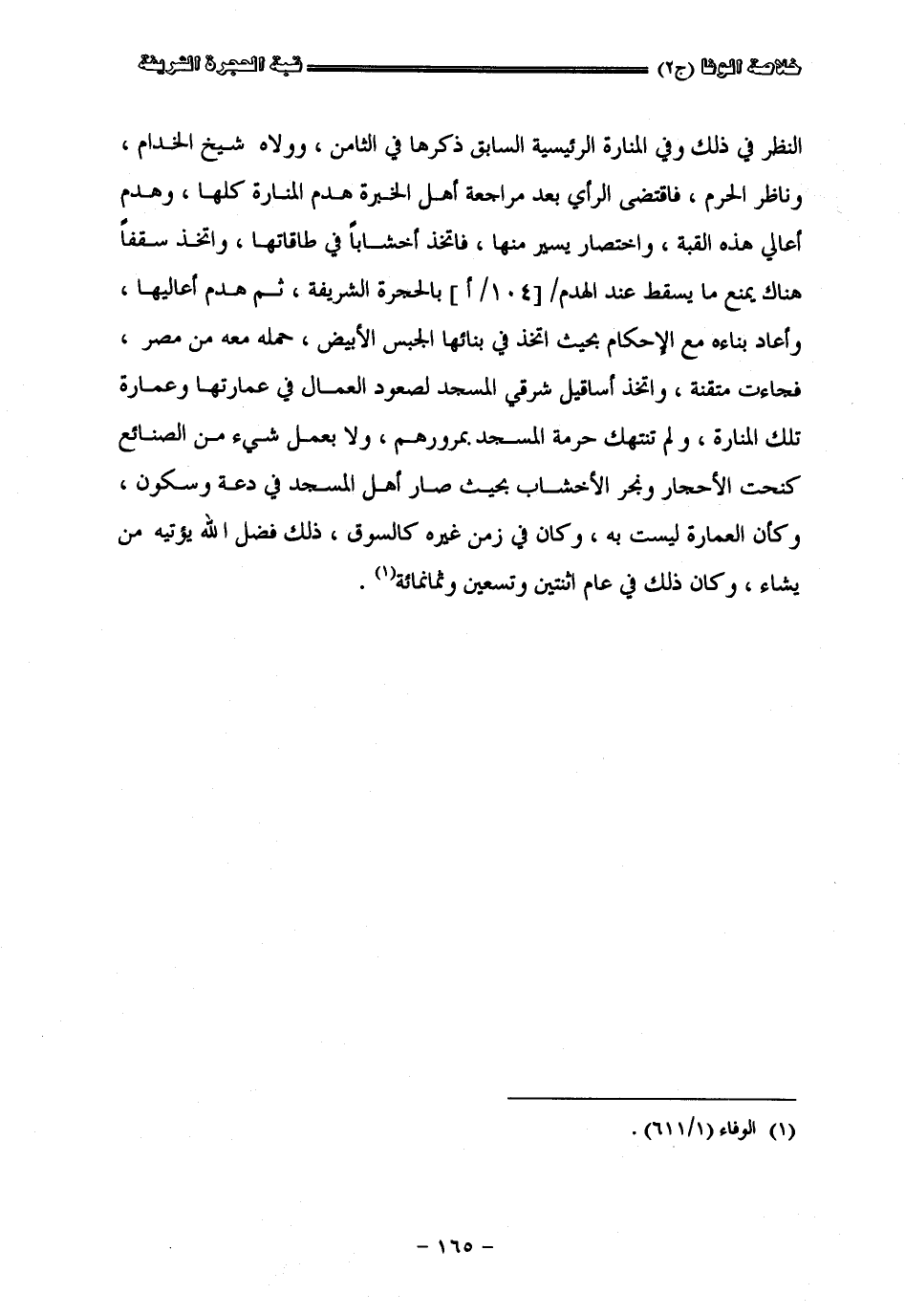 النظر في ذلك وفي المنارة الرئيسية السابق ذكرها في الثامن وولاه شيخ الخدام وناظر الحرم فاقتضى الرأي بعد مراجعة أهل الخبرة هدم المنارة كلها وهدم أعالي هذه القبة واختصار يسير منها فأتخذ أخشابا في طاقاتها وأتخذ سقفا هناك يمنع ما يسقط عند الهدم بالحجرة الشريفة ثم هدم أعاليها وأعاد بناءه مع الأحكام بحيث أتخذ في بنائها الجبس الأبيض حمله معه من مصر فجاءت متقنة وأتخذ أساقيل شرقيّ المسجد لصعود العمال في عمارتها وعمارة تلك المنارة ولم تنتهك حرمة المسجد في دعة وسكون وكان العمارة ليست به وكان في زمن غيره كالسوق ذلك فضل الله يؤتيه من يشاء وكان ذلك في عام اثنتين وتسعين وثمانمائة.