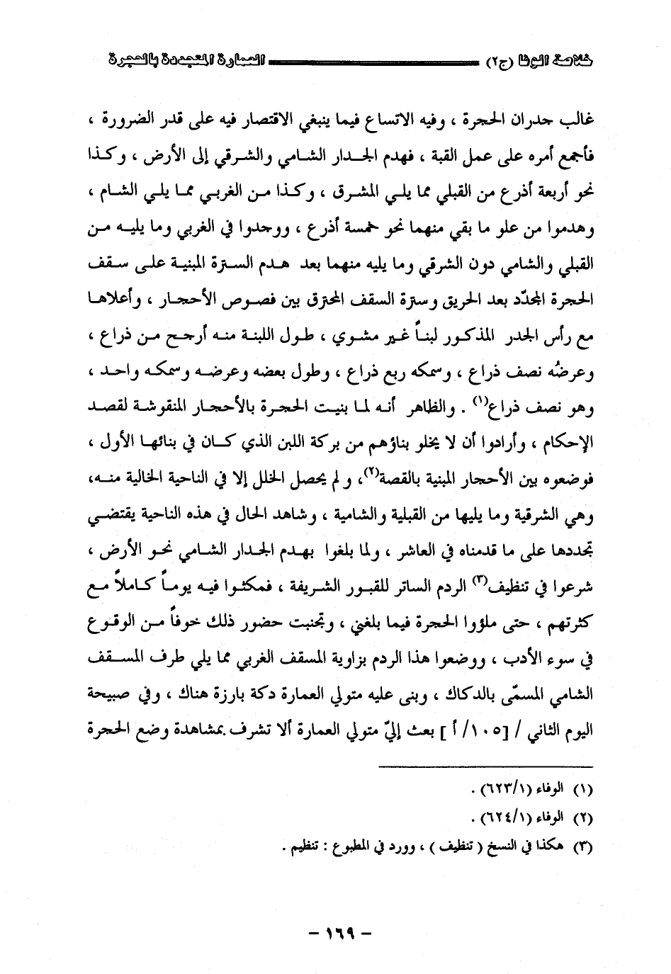 غالب جدران الحجرة وفيه الاتساع فيما ينبغي الاقتصار فيه على قدر الضرورة فأجمع أمره على عمل القبة فهدم الجدار الشامي والشرقي إلى الأرض وكذا نحو أربعة أذرع من القبلي مما يلي المشرق وكذا من الغربي مما يلي الشام وهدموا من علو ما بقى منهما نحو خمسة أذرع ووجدوا في الغربي وما يليه من القبلي والشامي دون الشرقي وما يليه منهما بعد هدم السترة المبنية على سقف الحجرة المجدّد بعد الحريق وسترة السقف المحترق بين فصوص الأحجار وأعلاها مع رأس الجدر المذكورة لبنا غير مشوي طول اللبنة منه أرجح من ذراع وعرضها نصف ذراع وسمكها ربع ذراع وطول بعضه وعرضه وسمكه واحد وهو نصف ذراع والظاهر إنه لما بنيت الحجرة بالأحجار المنقوشة لقصد الأحكام وأرادوا أن لا يخلو بناؤهم من بركة اللبن الذي كان في بنائها الأوّل فوضعوه بين الأحجار المبنية بالقصة ولم يحصل الخلل إلا في الناحية الخالية منه وهي الشرقي وما يليه من القبلي والشامي وشاهد الحال في هذه الناحية يقتضي تجدّدها على ما قدمناه في العاشر ولما بلغوا بهدم الجدار الشامي نحو الأرض شرعوا في تنظيم الردم السائر للقبور الشريفة فمكثوا فيه يوما كاملا مع كثرتهم حتى ملؤا الحجرة فيما بلغني وتجنبت حضور ذلك خوفا من الوقوع في سوء الأدب ووضعوا هذا الردم بزاوية المسقف الغربي مما يلي طرف المسقف الشامي المسمى بالدكاك وبنى عليه متولي العمارة دكة بارزة هناك وفي صبيحة اليوم الثاني بعث إليّ متولي العمارة ألا تشرف بمشاهدة وضع الحجرة