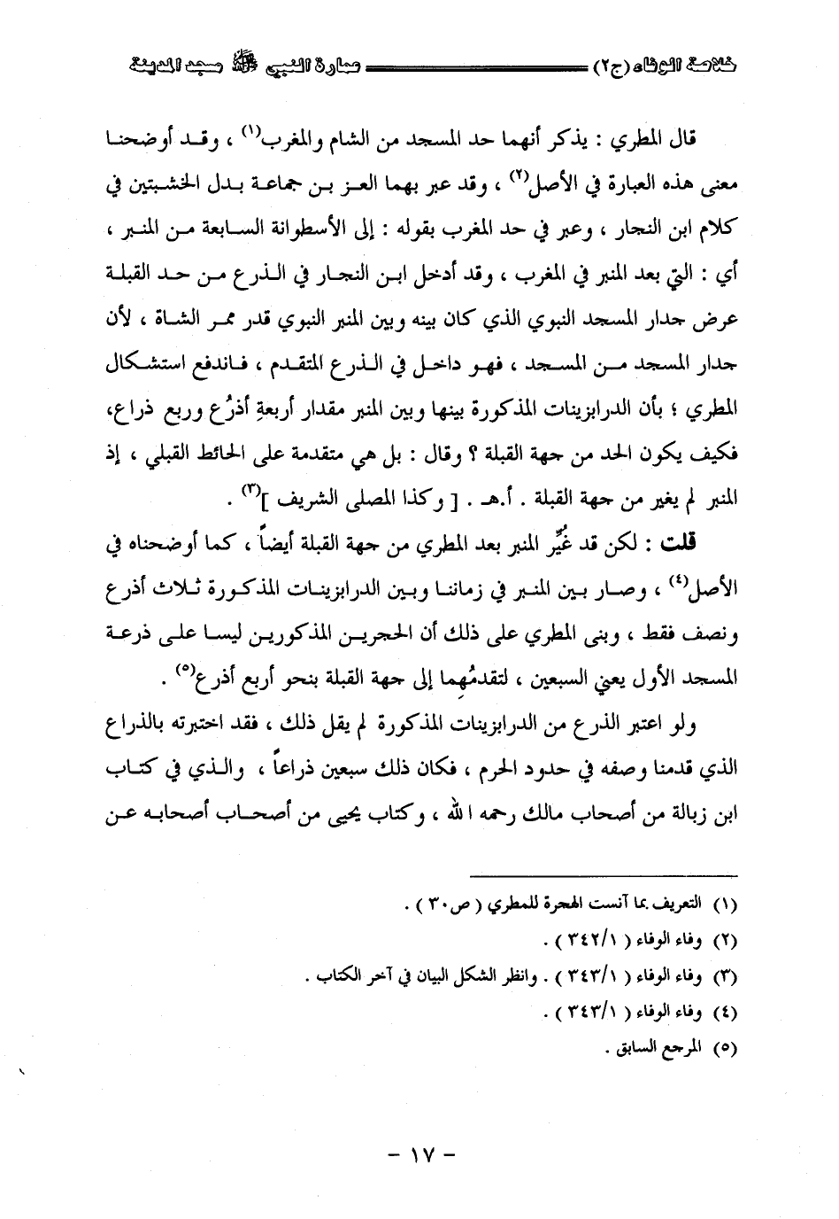 قال المطري يذكرانهما حدّ المسجد من الشام والمغرب وقد أوضحنا معنى هذه العبارة في الأصل وقد عبر بهما العز بن جماعة بدل الخشبتين في كلام ابن النجار وعبر في حدّ المغرب وبقوله إلى الأسطوانة السابعة من المنبر أي بعد المنبر في المغرب وقد أدخل ابن النجار في الذرع من حدّ القبلة عرض جدار المسجد النبوي الذي كان بينه وبين المنبر النبوي قدر ممرّ الشاة لأن جدار المسجد من المسجد فهو داخل في الذرع المتقدم فأندفع استشكال المطري بأن الدرابزينات المذكورة بينها وبين المنبر مقدار أربعة أذرع وربع ذراع فكيف يكون الحدّ من جهة القبلة بل هي متقدمة على الحائط القبلي إذ المنبر لم يغير من جهة القبلة اه قلت لكن قد غير المنبر بعد المطري من جهة القبلة أيضا كما أوضحنا في الأصل وصار بين المنبر وفي زماننا وبين الدرابزينات المذكورة ثلاث أذرع ونصف فقط وبني المطري على ذلك أن الحجرين المذكورين ليساعد على ذرعة المسجد الأول يعني السبعين لتقدّمها إلى جهة القبلة بنحو أربع أذرع ولو أعتبر الذرع من الدرابزينات المذكورة لم يقل ذلك فقد اختبرته بالذراع الذي قدمنا وصفه في حدود الحرم فكان ذلك سبعين ذراعا والذي في كتاب ابن زبالة من أصحاب مالك رحمه الله وكتاب يحيي من أصحاب أصحابه عن