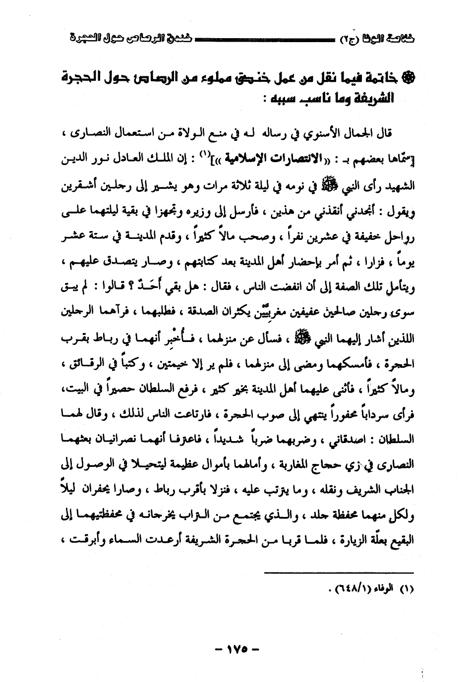 " خاتمة فيما نقل من عمل خندق مملوء من الرصاص حول الحجرة الشريفة وما ناسب سببه " قال الجمال الأسنوي في رسالة له في منع الولاة من استعمال النصارى إن الملك العادل نور الدين الشهيد رأى النبيّ صلى الله عليه وسلم في نومه في ليلة ثلاث مرات وهو يشير إلى رجلين أشقر بن ويقول أنجدني أنقذني من هذين فأرسل إلى وزيره وتجهزا في بقية ليلتهما على رواحل خفيفة في عشرين نفرا وصحب مالا كثيرا وقدم المدينة في ستة عشر يوما فزارا ثم أمر بإحضار أهل المدينة بعد كتابتهم وصار يتصدّق عليهم ويتأمل تلك الصفة إلى أن انفضت الناس فقال هل بقى أحد قالوا لم يبق سوى رجلين صالحين عفيفين مغربيين يكثران الصدقة فطلبهما فرآهما فإذا هما الرجلان اللذان أشار إليهما النبيّ صلى الله عليه وسلم فسأل عن منزلهما فأخبرانهما في رباط بقرب الحجرة فأمسكهما ومضى إلى منزلهما فلم ير إلا خيمتين وكتبا في الرقائق ومالا كثيرا فأثنى عليهما أهل المدينة بخير كثير فرفع السلطان حصيرا في البيت فرأى سردابا محفورا ينتهي إلى صوب الحجرة فارتاعت الناس لذلك وقال لهما السلطان أصدقاني وضربهما ضربا شديدا فاعترفا إنهما نصرانيان بعثهما سلطان النصارى في زي حجاج المغاربة وأمالهما بأموال عظيمة ليتحيلا في الوصول إلى الجناب الشريف ونقله وما يترتب عليه فنزلا بأقرب رباط وصارا يحفران ليلا ولكل منهما محفظة جلد والذي يجتمع من التراب يخرجانه في محفظتيهما إلى البقيع بعلة الزيارة فلما قربا من الحجرة الشريفة أرعدت السماء وأبرقت