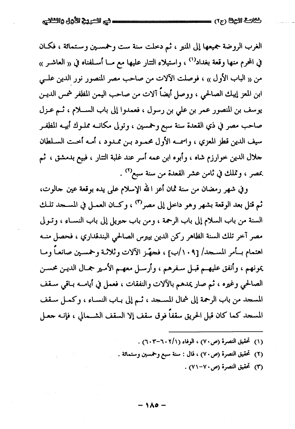 المغرب الروضة جميعها إلى المنبر ثم دخلت سنة ست وخمسين وستمائة فكان في الحرّم منها وقعة بغداد واستيلاء التتار عليها مع ما أسلفناه في العاشر من الباب الأوّل فوصلت الآلات من صاحب مصر المنصور نور الدين علي بن المعوايبك الصالحي ووصل أيضا آلات من صاحب اليمن المظفر شمس الدين يوسف بن المنصور عمر بن علي بن رسول فعمدوا إلى باب السلام ثم عزل صاحب مصر في ذي القعدة سنة سبع وخمسين وتولى مكانه مملوك أبيه المظفر سيف الدين قطز المعزي واسمه الأوّل محمود بن ممدود أمه أخت السلطان جلال الدين خوارزم شاه وأبوه أبن عمه أسر عند غلبة التتار فبيع بدمشق ثم بمصر وتملك في ثامن عشر القعدة من سنة سبع وفي شهر رمضان من سنة ثمان أعز الله الإسلام على يده بوقعة عين جالوت ثم قتل بعد الوقعة بشهر وهو داخل إلى مصر وكان العمل في المسجد تلك السنة من باب السلام إلى باب الرحمة ومن باب جبريل إلى باب النساء وتولى مصر آخر تلك السنة الظاهر ركن الدين بيبرس الصالحي البندقداري فحصل منه اهتمام بأمر المسجد فجهز الآلات وثلاثة وخمسين صانعا وما يمونهم وأنفق عليهم قبل سفرهم وأرسل معهم الأمير جمال الدين محسن الصالحي وغيره ثم صار يمدّهم بالآلات والنفقات فعمل في أيامه باقي سقف المسجد من باب الرحمة إلى شمالي المسجد ثم إلى باب النساء وكمل سقف المسجد كما كان قبل الحريق سقفا فوق سقف إلا السقف الشمالي فإنه جعل