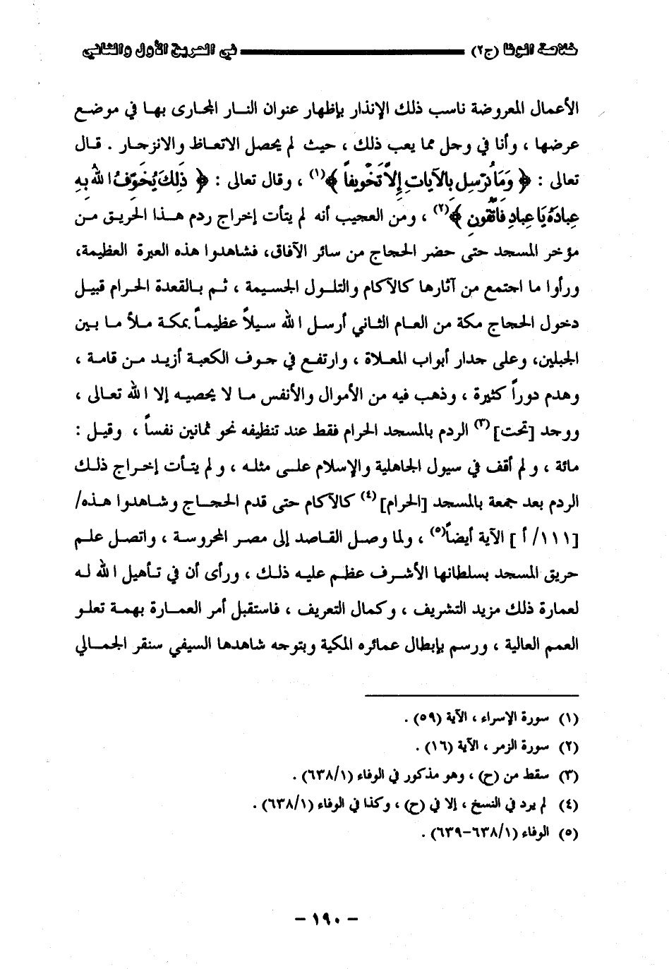 الأعمال المعروضة ناسب ذلك الإنذار بإظهار عنوان النار المجاري بها في موضع عرضها وأنا في وجل مما يعقب ذلك حيث لم يحصل الاتعاظ والانزجار قال تعالى (وما نرسل بالآيات إلا تخويفا) وقال تعالى (ذلك يخوّف الله به عباده يا عباد فاتقون) ومن العجيب إنه لم يتأت إخراج ردم هذا الحريق من مؤخر المسجد حتى حضر الحجاج من سائر الآفاق فشاهدوا هذه العبرة العظيمة ورأوا ما أجتمع من آثارها كالآرام والتلول الجسيمة ثم بالقعدة الحرام قبيل دخول الحجاج مكة من العام الثاني أرسل الله سيلا عظيما بمكة ملأ ما بين الجبلين وعلا جدار أبواب المعلاة وأرتفع في جوف الكعبة أزيد من قامة وهدم دورا كثيرة وذهب فيه من الأموال والأنفس ما لا يحصيه إلا الله تعالى ووجد تحت الردم المسجد الحرام فقط عند تنظيفه نحو ثمانين نفسا وقيل مائة ولم أقف في سيول الجاهلية والإسلام على مثله ولم يتأت إخراج ذلك الردم بعد جمعة بالمسجد كالأردام حتى قدم الحجاج وشاهدوا هذه الآية أيضا ولما وصل القاصد إلى مصر المحروسة وأتصل علم حريق المسجد بسلطانها الأشرف عظم عليه ذلك ورأى إن في تأهيل الله له لعمارة وذلك مزيد التشريف وكمال التعريف فاستقبل أمر العمارة بهمة تعلوا لهم العلية ورسم بأبطال عمائره المكية وبتوجيه شاهدها الماليفي سنقر الجمالي