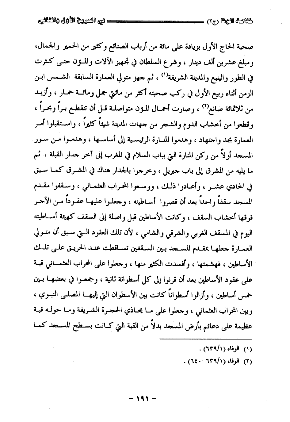 صحبة الحاج الأوّل بزيادة على مائة من أرباب الصنائع وكثير من الحمير والجمال ومبلغ عشرين ألف دينار وشرع السلطان في تجهيز الآلات والمؤن حتى كثرت في الطور والينبع والمدينة الشريفة ثم جهز متولي العمارة السابقة الشمس بن الزمن أثناء ربيع الأوّل في ركب صحبته أكثر من مائتي جمل ومائة حمار وأزيد من ثلاثمائة صانع وصارت أحمال المؤن متواصلة قل أن تنقطع برا وبحرا وقطعوا من أخشاب الدوم والشجر من جهات المدينة شيئاً كثيرا واستقبلوا أمر العمارة بجدّ واجتهاد وهدموا المنارة الرئيسية إلى أساسها وهدموا من سور المسجد أوّلا من ركن المنارة التي بباب السلام في المغرب إلى آخر جدار القبلة ثم ما يليه من المشرق إلى باب جبريل وخرجوا بالجدار هناك في المشرق كما سبق في الحادي عشر وأعادوا ذلك ووسعوا المحراب العثماني وسقفوا مقدّم المسجد سقفا واحدا بعد أن قصروا أساطينه وجعلوا عليها عقودا من الآجر فوقها أخشاب السقف وكانت الأساطين قبل واصلة إلى السقف كهيئة أساطينه اليوم في المسقف الغربي والشرقي والشامي لأن تلك العقود التي سبق إن متولي العمارة جعلها بمقدّم المسجد بين السقفين تساقطت عند الحريق على الأساطين فهشمتها وأفسدت الكثير منها وجعلوا على المحراب العثماني قبة على عقود الأساطين بعد أن قرنوا إلى كل أسطوانة ثانية وجمعوا في بعضها بين خمس أساطين وأزالوا أسطوانة كانت بين الأسطوانة التي إليها المصلى النبوي وبين المحراب العثماني وجعلوا على ما يحاذي الحجرة الشريفة وما حوله قبة عظيمة على دعائم بأرض المسجد بدلا عن القبة التي كانت بسطح المسجد كما