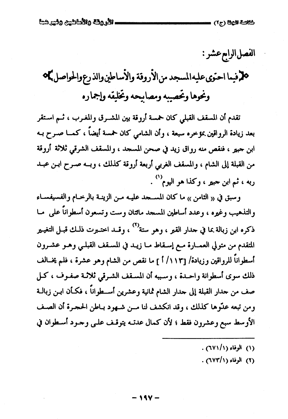 " الفصل الرابع عشر " فيما احتوى عليه المسجد من الأروقة والأساطين والذرع والحواصل ونحوها وتحصينه ومصابيحه وتخلقه وأجماره