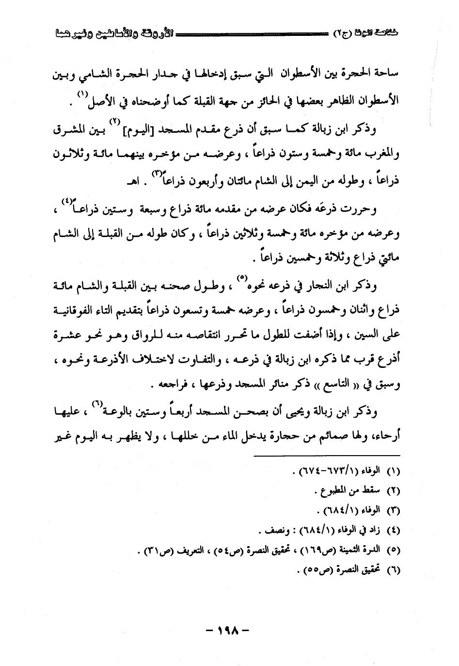 ساحة الحجرة بين الأسطوانة التي سبق إدخالها في جدار الحجرة الشامي وبين الأسطوانة الظاهر بعضها في الحائز من جهة القبلة كما أوضحنا في الأصل وذكر أبن زبالة كما سبق إنّ ذرع مقدّم المسجد اليوم بين المشرق والمغرب مائة وخمسة وستون ذراعا وعرضه من مؤخره بينهما مائة وثلاثون ذراعا وطوله من اليمن إلى الشام مائتان وأربعون ذراعا اه وحررت ذرعه فكان عرضه من مقدّمه مائة ذراع وسبعة وستين ذراعا وعرضه من مؤخره مائة وخمسة وثلاثين ذراعا وكان طوله من القبلة إلى الشام مائتي ذراع وثلاثة وخمسين ذراعا وذكر أبن النجار في ذرعه نحوه وطول صحنه بين القبلة والشام مائة ذراع واثنان وخمسون ذراعا وعرضه خمسة وتسعون ذراعا بتقديم التاء الفوقانية على السين وإذا أضفت للطول ما تحرر انتقاصه منه للرواق وهو نحو عشرة أذرع قرب مما ذكره أبن زبالة في ذرعه والتفاوت لاختلاف الذرعة ونحوه وسبق في التاسع ذكر منائر المسجد وذرعها فراجعه وذكر أبن زبالة ويحيى أن بصحن المسجد أربعة وستين بالوعة عليها أرحاء ولها صمائم من حجارة يدخل الماء من خلالها ولا يظهر به اليوم غير