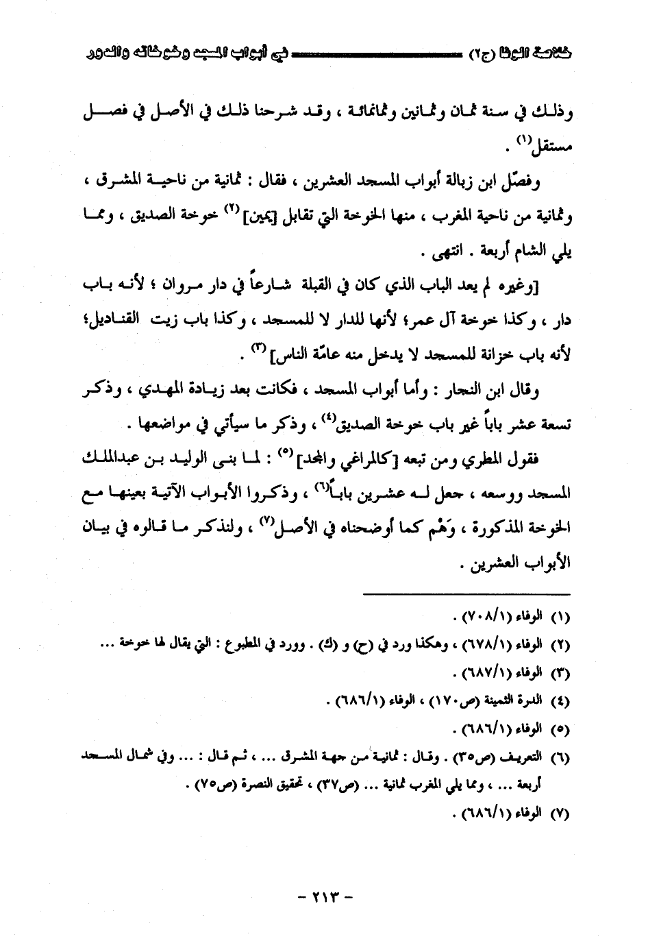 وذلك في سنة ثمان وثمانين وثمانمائة وقد شرحنا ذلك في الأصل في فصل مستقل وفصل أبن زبالة أبواب المسجد العشرين فقال ثمانية من ناحية المشرق وثمانية من ناحية المغرب منها الخوخة التي يقال لها خوخة الصدّيق ومما يلي الشام أربعة انتهى وقال أبن النجار وأمّا أبواب المسجد فكانت بعد زيادة المهدي وذكر تسعة عشر بابا غير باب خوخة الصدّيق وذكر ما سيأتي في مواضعها فقول المطري ومن تبعه لما بنى الوليد بن عبد الملك المسجد وسعه جعل له عشرين بابا وذكروا الأبواب الآتية بعينها مع الخوخة المذكورة وهم كما أوضحناه في الأصل ولنذكر ما قالوه في بيان الأبواب