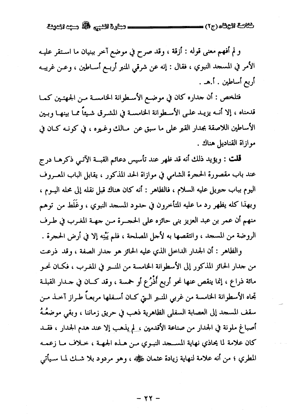 ردّ ما عليه المتأخرون في حدود المسجد النبوي وغلط من توهم منهم أنّ عمر بن عبد العزيز بنى حائزة على الحجرة من جهة المغرب في طرف الروضة الشريفة من المسجد وأنقصها به لأجل المصلحة فلم يبنه إلا في أرض الحجرة والظاهر أنّ الجدار الداخل الذي عليه الحائز هو جدار الصفة وقد ذرعت من جدار الحائز المذكور إلى الأسطوانة الخامسة من المنبر في المغرب فكان نحو مائة ذراع إنما ينقص عنها نحو أربع أذرع أو خمس وقد كان في جدار القبلة تجاه الأسطوانة الخامسة من غربي المنبر التي كان أسفلها مربعا طراز آخذ من سقف المسجد إلى العصابة السفلى الظاهرية ذهب في حريق زماننا وبقى موضعه أصباغ ملونة في الجدار من صناعة الأقدمين لم تذهب إلا عند هدم الجدار فقد كان علامة لما يحاذي نهاية المسجد النبوي من هذه الجهة خلاف ما زعمه المطري من إنه علامة لنهاية زيادة عثمان رضي الله عنه وهو مردود بلا شك لما سيأتي من أن عمر رضي الله عنه زاد من جهة المغرب دون المشرق وأنه جعل عرض المسجد مائة وعشرين ذراعا فيكون زاد على المسجد الأصلي عشرين ذراعا في هذه الجهة وهي أسطوانتان كما يعلم مما ذكر في ذرع ما بين كل أسطوانتين ولما سيأتي من أن عثمان رضي الله عنه زاد بعده في المغرب أسطوانة فقط وأن الوليد زاد بعده أسطوانتين وعليه استقر أمر الزيادة في المغرب ولا شك إن من الأسطوانة الخامسة المحاذية للطراز المذكور إلى جدار المسجد الغربي اليوم خمس أساطين فقط فثلاث منها لعمر وعثمان رضي الله عنه وثنتان للوليد فلو كان الطراز لمذكور نهاية زيادة عثمان رضي الله عنه لكان بعده أسطوانتان للوليد فتبقى ثلاث أساطين زيدت بعد الوليد ولا قائل به إنما أوقع المطري في ذلك اعتماده لأن نهاية المسجد النبوي في المغرب الأسطوانة التي بعد المنبر وهو عجيب لأنه جازم بأن موضع المنبر لم يغير باتفاق فكيف يجعل النبيّ صلى الله عليه وسلم منبره الذي يقف عليه لمخاطبة أصحابه في طرف مسجده ر يتوسطهم وإنما الصواب ما قدمناه وإنما أطلنا في ذلك لدفع ما تقدّم من التوهم ولما تصح ما أسلفناه للمقر الشجاعي شاهين الجمالي ناظر الحرم النبوي اتخذ لأعالي الأسطوانة الخامسة من المنبر من صف الأساطين التي في قبلة المنبر طرازا متصلا بالسقف بدلا عن الطراز الذي كان تجاهها في جدار القبلة ونقش فيه ما حاصله إن ذلك هو الذي استقر عليه الأمر في نهاية المسجد النبوي وحدّه وفقنا الله وإياه لحفظ الحدود وألحقنا بالمقرّبين الشهود ويتقرع على ذلك ما قيل في اختصاص المضاعفة بالمسجد النبوي دون ما زيد فيه وقد حققنا المسألة في الأصل فراجعهليه المتأخرون في حدود المسجد النبوي وغلط من توهم منهم أنّ عمر بن عبد العزيز بنى حائزة على الحجرة من جهة المغرب في طرف الروضة الشريفة من المسجد وأنقصها به لأجل المصلحة فلم يبنه إلا في أرض الحجرة والظاهر أنّ الجدار الداخل الذي عليه الحائز هو جدار الصفة وقد ذرعت من جدار الحائز المذكور إلى الأسطوانة الخامسة من المنبر في المغرب فكان نحو مائة ذراع إنما ينقص عنها نحو أربع أذرع أو خمس وقد كان في جدار القبلة تجاه الأسطوانة الخامسة من غربي المنبر التي كان أسفلها مربعا طراز آخذ من سقف المسجد إلى العصابة السفلى الظاهرية ذهب في حريق زماننا وبقى موضعه أصباغ ملونة في الجدار من صناعة الأقدمين لم تذهب إلا عند هدم الجدار فقد كان علامة لما يحاذي نهاية المسجد النبوي من هذه الجهة خلاف ما زعمه المطري من إنه علامة لنهاية زيادة عثمان رضي الله عنه وهو مردود بلا شك لما سيأتي
