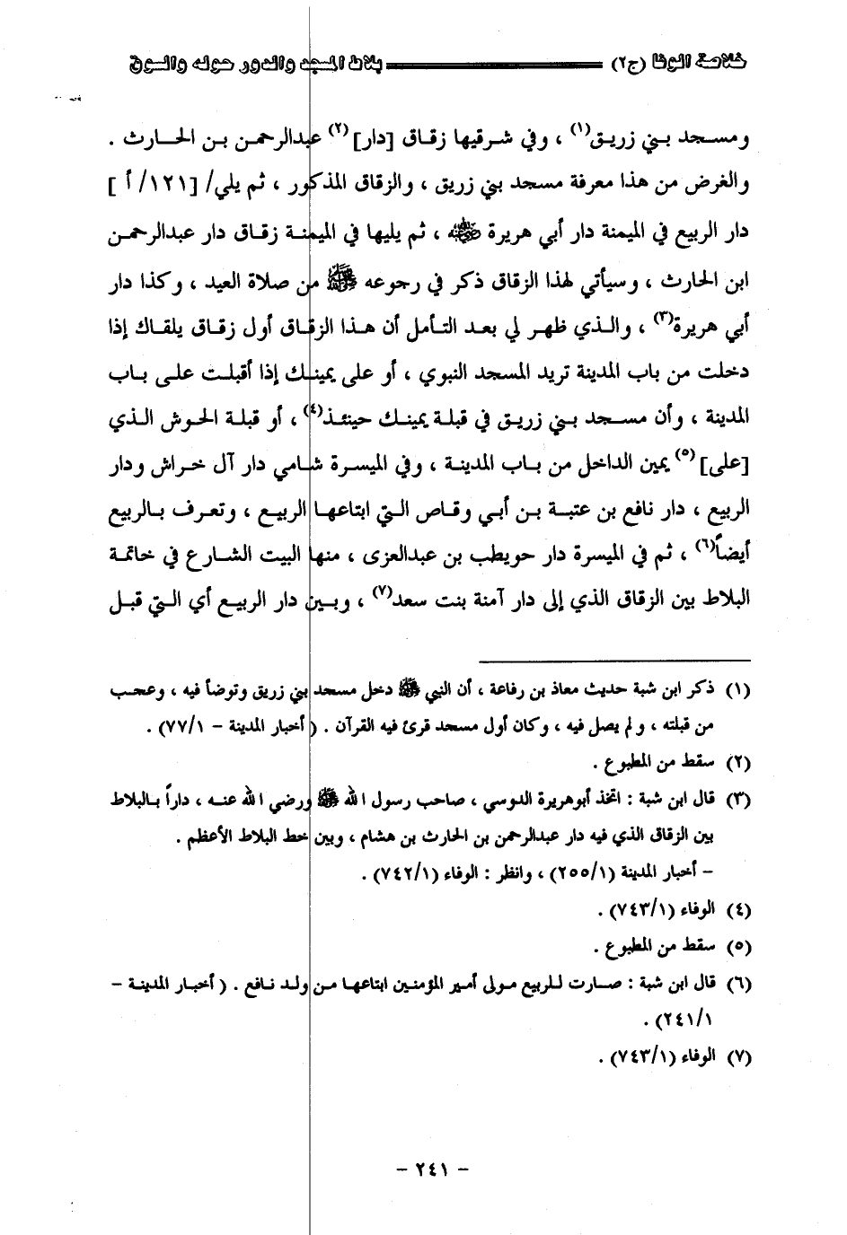 الذي على يمين الداخل من باب المدينة وفي الميسرة شامي دار آل خراش ودار الربيع دار نافع بن عتبة بن أبي وقاص التي أبتاعها الربيع وتعرف بالربيع أيضا ثم في الميسرة دار حويطب بن عبد العزي منها البيت الشارع على خاتمة البلاط بين الزقاق الذي إلى دار آمنة بنت سعد وبين دار الربيع التي قبل هذه وبجنبها دار عمرو بن أبي وقاص التي في زقاق حلوة بين دار حويطب وبين خط الرزقاق الذي فيه دار آمنة وخاتمة البلاط هو الشارع الممتد على يسار الداخل من باب المدينة إلى مشهد مالك بن سنان ولعلّ زقاق حلوة وسيأتي ذكره في الآبار هو المعروف اليوم بزقاق الطوال هناك ثم يلي زقاق عبد الرحمن بن الحرث في الميمنة دار عبد الرحمن بن عوف ثم يليها في الميمنة زقاق أبي أمية بن المغيرة ثم يلي الزقاق في الميمنة دار خالد بن سعد ويقال لها دار أبن عتبة ثم يلي دار خالد دار أبي الجهم ثم دار نوفل بن عدي ودار أبي الجهم هي المرادة بقول مالك بن أبي عامر كما في الموطأ كنا نسمع قراءة عمر بن الخطاب ونحن عند دار أبي الجهم بالبلاط ويقول موسى بن عقبة إن رجال بني قريظة قتلوا عند دار أبي الجهم التي بالبلاط ولم يكن يومئذ بلاط فزعموا إن دماءهم بلغت أحجار الزيت التي كانت بالسوق عند دار العباس بن عبد المطلب التي اقطعها له عمر بن الخطاب عند خاتمة البلاط ومشهد مالك بن سنان وهو مخالف لما سبق في قصتهم من أن النبي صلى الله عليه وسلم خندق لهم خنادق بسوق المدينة وضرب أعناقهم بها. وأما السوق فروى ابن شبة عن عطاء بن دينار قال لما أراد رسول الله صلى الله عليه وسلم أن يجعل للمدينة سوقا أتى سوق بني قينقاع ثم جاء سوق المدينة فضربه برجله وقال هذا سوقكم فلا يضيق ولا يؤخذن فيه خراج ولأبن زبالة عن سهل أن النبي صلى الله عليه وسلم أتى بني ساعد فقال إني جئتكم في حاجة تعطوني مكان مقابركم فأجعلها سوقا وكانت مقابرهم ما حازت دار ابن أبي ذئب أي شرق السوق عند انتهائه من جهة الشام إلى دار زيد بن ثابت أي في شرقيه أيضا قرب انتهائه مما يلي القبلة فأعطوه إياه فجعله سوقا ونقل ابن زبالة عرض سوق المدينة ما بين المصلى أي من القبلة إلى جرار سعد بن عبادة وهي جرار كان يسقى الناس فيها الماء بعد موت أمه أي أن الجرار كانت في حده من جهة الشام قرب ثنية الوداع كما يؤخذ مما ذكروه في الدار التي بناها إبراهيم بن هشام في ولايته لهشام بن عبد الملك وأخذ بها سوق المدينة كله وسلبها وجوه الدور الشوارع في السوق وبنى ذلك كله حوانيت وعلالي تكرى وجعل فيها الأسواق كلها أنه جعل لهذه الدار بابا شاميا مقابل الثنية خلف زاوية دار عمر بن عبد العزيز التي بالثنية وبابا عظيما عند التمارين يقابل المصلى وكان جدارها الشرق عند خاتمة البلاط التي عند دار العباس بالزوراء قرب مشهد مالك بن سنان وسد به وجه دار العباس المذكور وما يليها من الدور في الشام والقبلة وجعل هذا الجدار لبني ساعد طريقا مبوبة وكذا لبني ضمرة وكذا لبني الديل وطريق بني الديل في المشرق قرب ثنية الوداع وجعل الجدار الآخر في المغرب من التمارين في شامي المصلى وسدّ به وجه الزوراء حتى ورد بها خيام بني غفار وجعل المخرج بني سلمة من زقاق ابن جبير بابا مبوبا عظيما وجعل لسكة أسلم بابا مبوبا ومساكنهم بموضع حصن أمير المدينة اليوم وما حوله في الغرب فلم يزل على ذلك حياة هشام بن عبد الملك حتى توفى فقدم بوفاته ابن مكرم الثقفي فلما أشرف على رأس ثنية الوداع صاح مات الأحول وأستخلف الوليد يزيد فوثب الناس على هذه الدار فهدموها وعلى يمين السوق فسدوها وكان أحدثها في سكك أهل المدينة ودخلت في بعض منازلهم فقال أبو معروفذي على يمين الداخل من باب المدينة وفي الميسرة شامي دار آل خراش ودار الربيع دار نافع بن عتبة بن أبي وقاص التي أبتاعها الربيع وتعرف بالربيع أيضا ثم في الميسرة دار حويطب بن عبد العزي منها البيت الشارع على خاتمة البلاط بين الزقاق الذي إلى دار آمنة بنت سعد وبين دار الربيع التي قبل