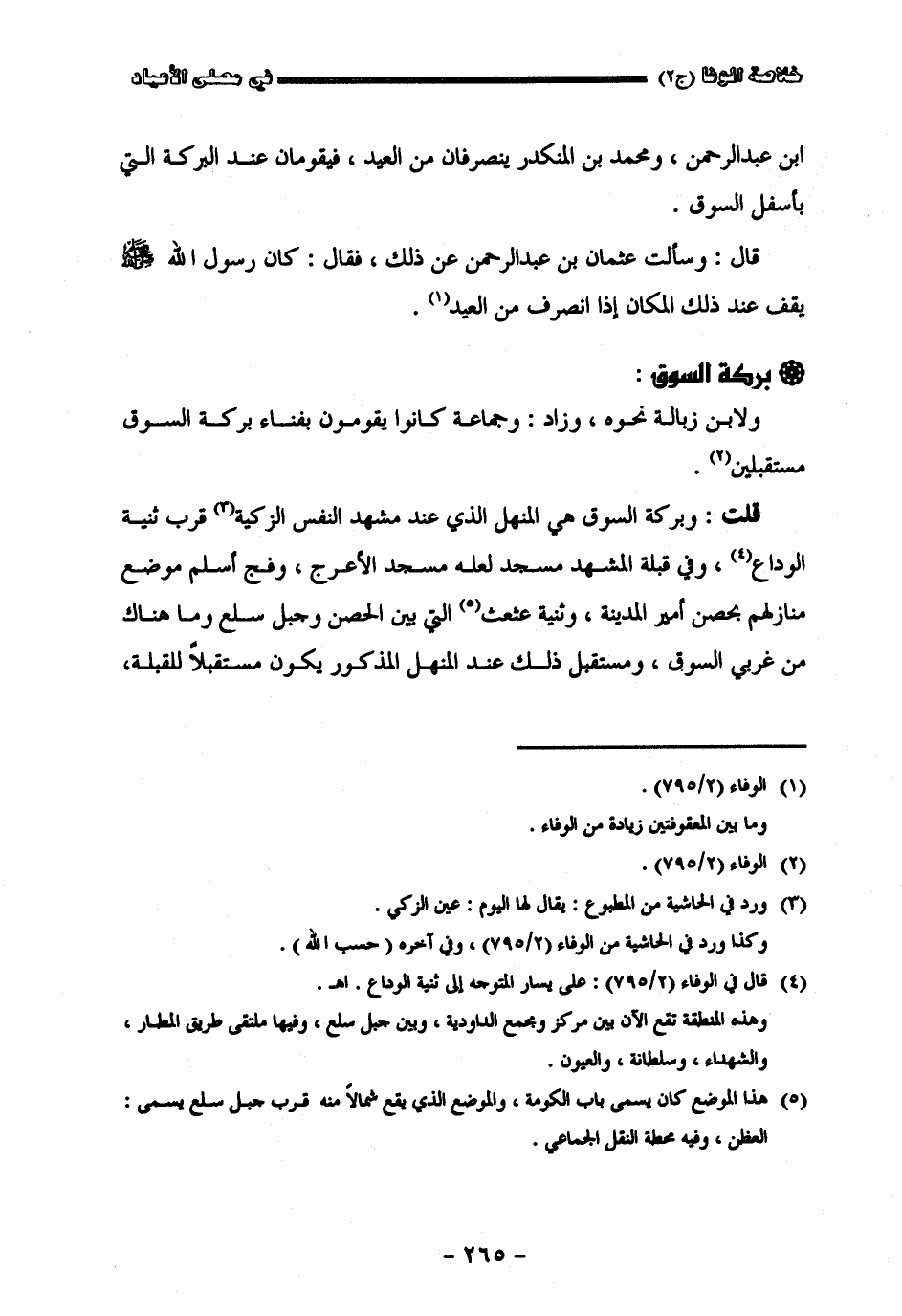 بن عبد الرحمن ومحمد بن المكدر ينصرفان من العيد فيقومان عند البركة التي بأسفل السوق قال وسألت عثمان بن عبد الرحمن عن ذلك فقال كان رسول الله صلى الله عليه وسلم يقف عند ذلك المكان إذا أنصرف من العيد ولابن زبالة نحوه وزاده وجماعة كانوا يقومون بفناء بركة السوق مستقبلين قلت وبركة السوق هي المنهل الذي عند مشهد النفس الزكية قرب ثنية الوداع وفي قبلة المشهد ومسجد لعله مسجد الأعرج وفج أسلم موضع منازلهم بحصن أمير المدينة وثنية عثعث التي بين الحصن وجبل سلع وما هناك من غربي السوق ومستقبل ذلك عند المنهل المذكور يكون مستقبلا للقبلة